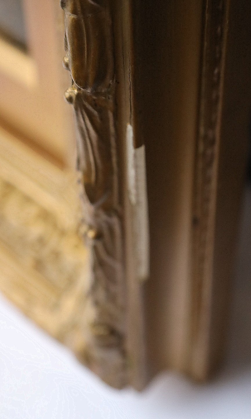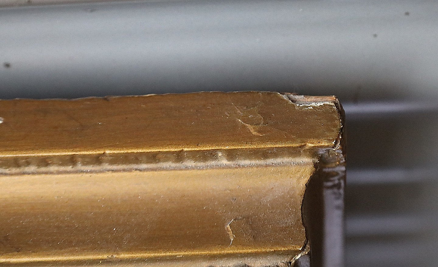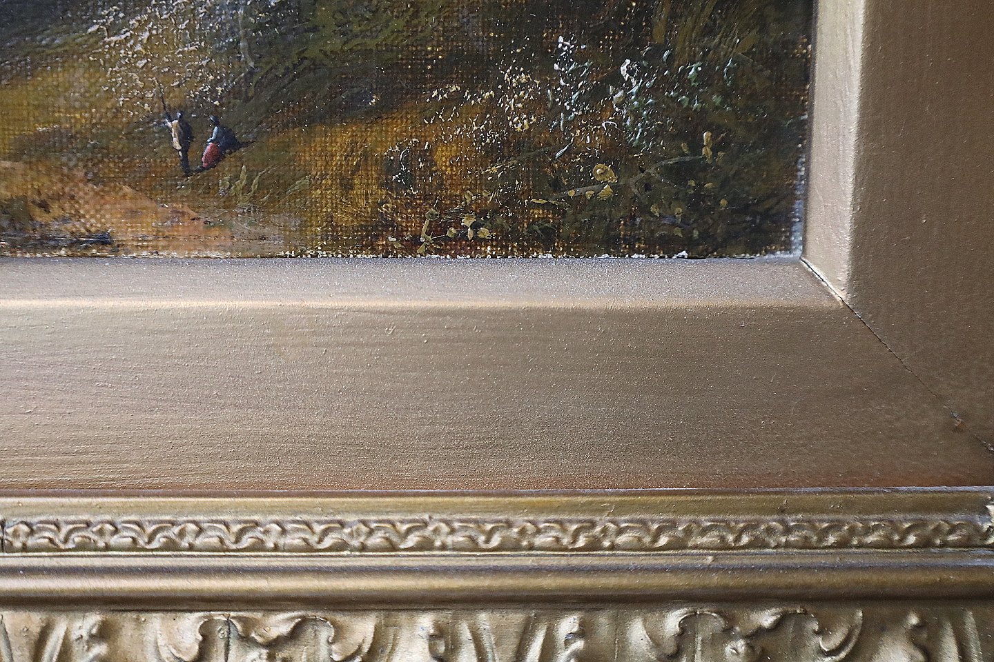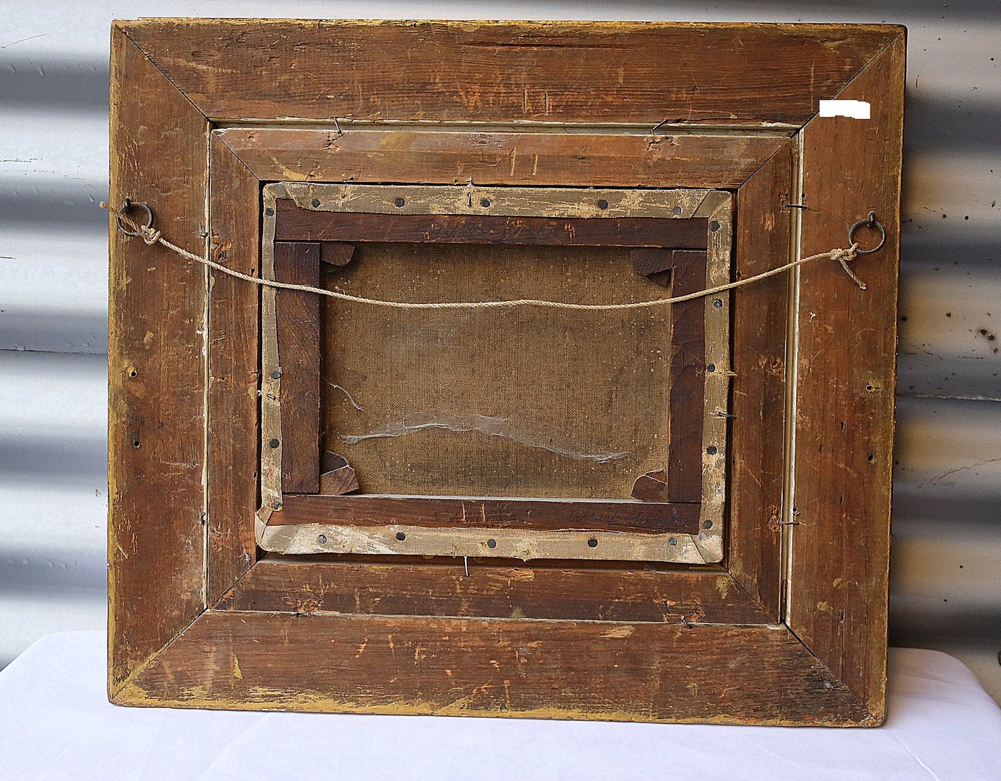 Lille maleri i stor guldramme. Maleriet er et klippestykke og en løbende flod, der går enkelte mennesker rundt. Der er brugsspor på rammen