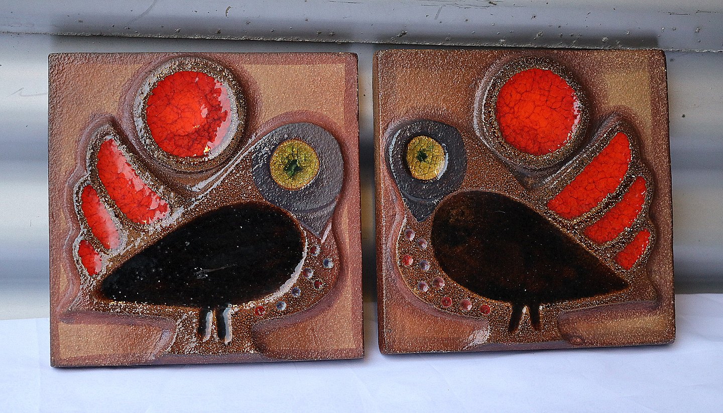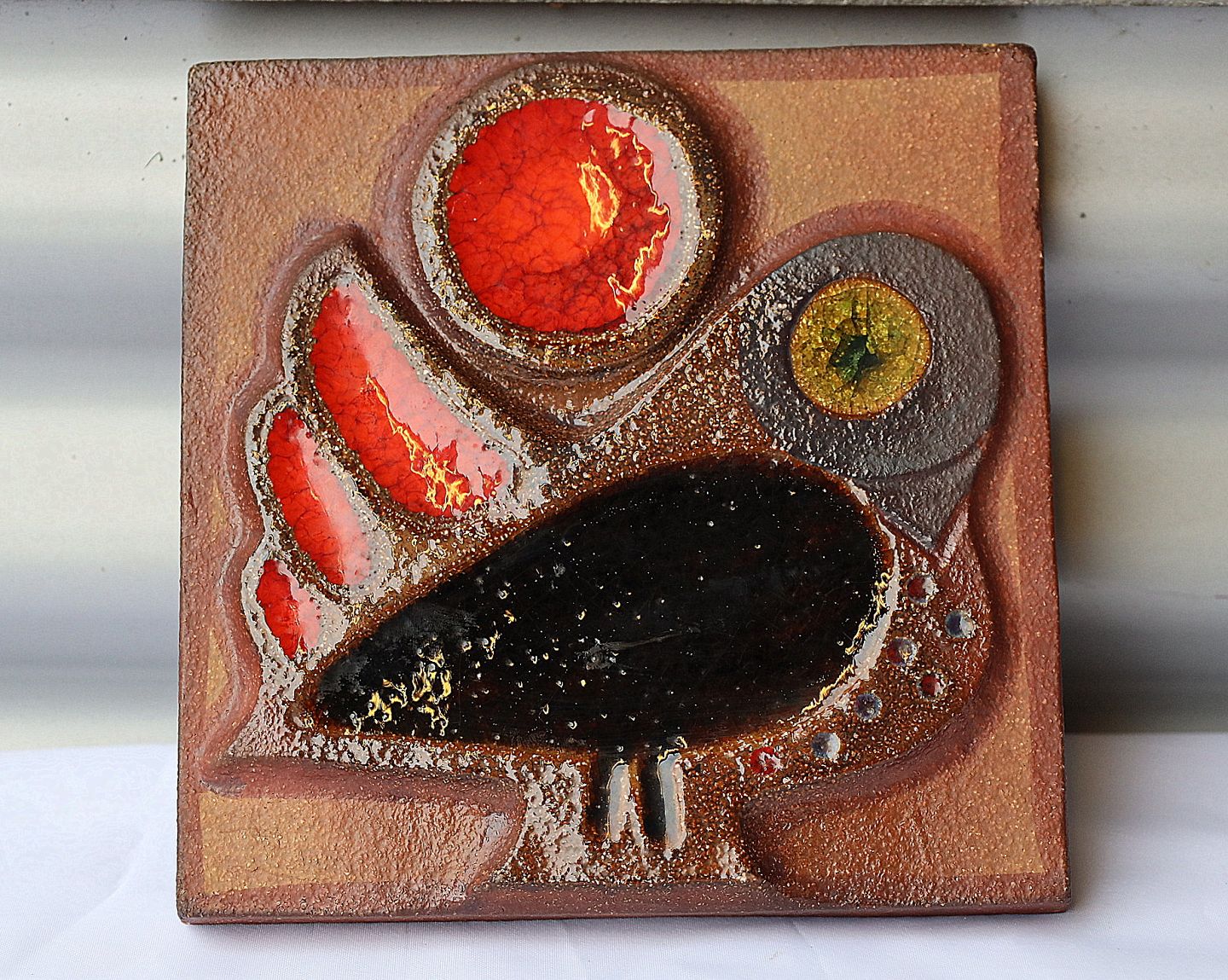 Søholm Keramik. Relief, nr. 3574-3 - fugl med rød vinge og rød sol. Relieffet er nr. 3 af en serie på 4.