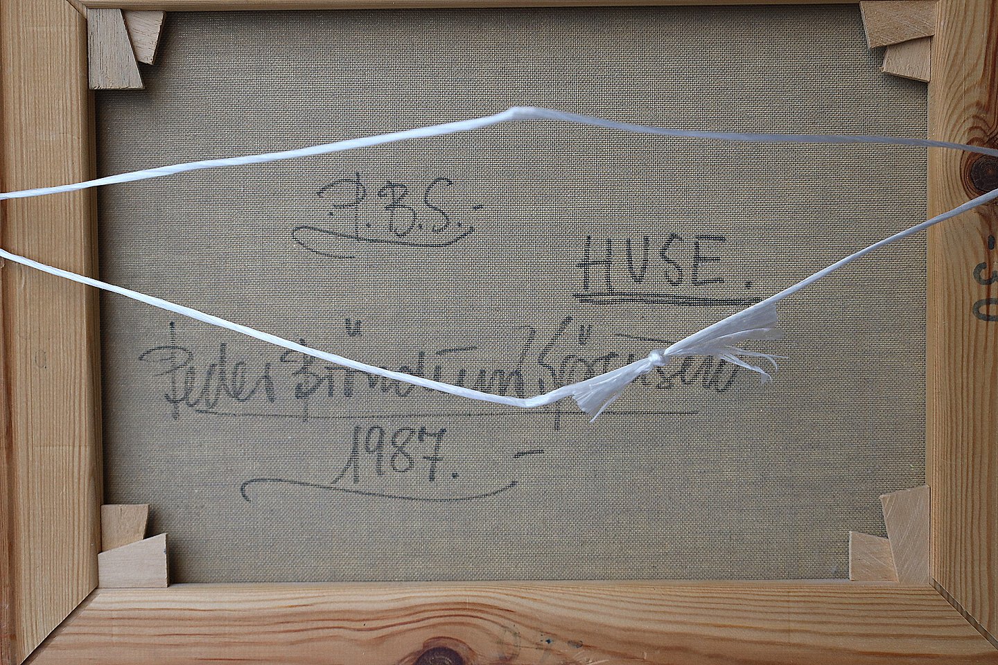 Maleri, Peder Brøndum Sørensen (1931-2001). Maleriet har titlen "Huse". Signeret PBS87. Maleriet er indrammet i guldramme med små brugsspor