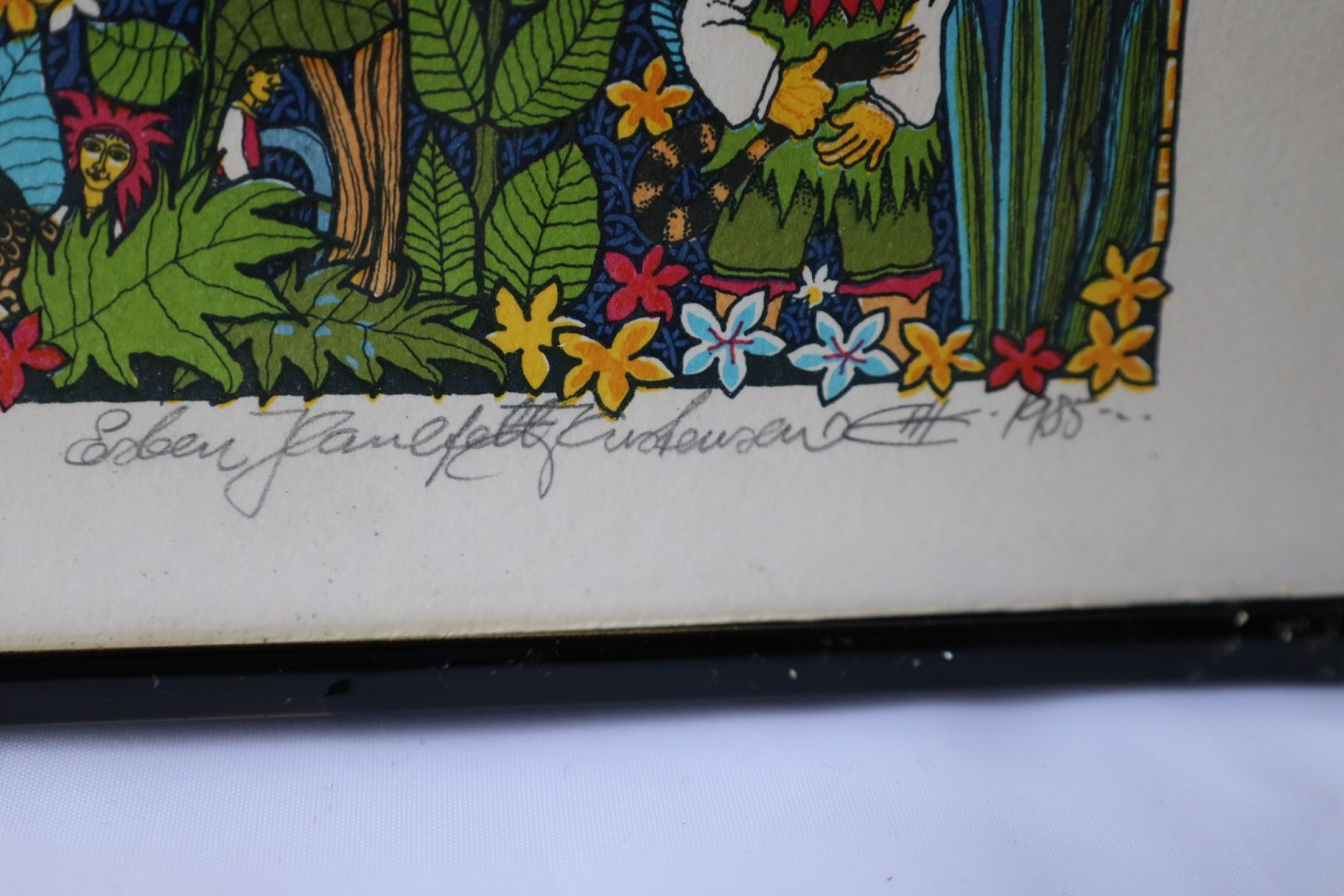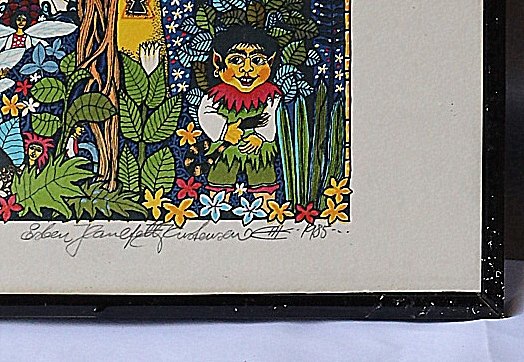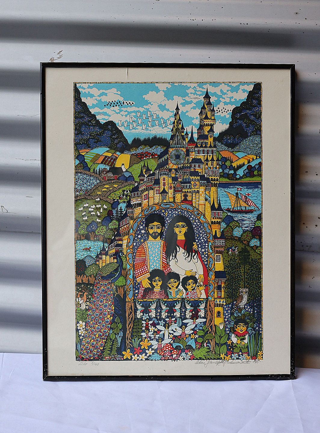 Litografi, nr. 8/160, Esben Hanefelt Kristensen. Aalborg kunstner Esben Hanefelt Kristensen, født 1952-. Litografiet forstiller en familie i "himmelport". Billedet er signeret Esben Hanefelt Kristensen 1985. Litografiet et i sort bejdset ramme, rammen har enkelte brugsspor.