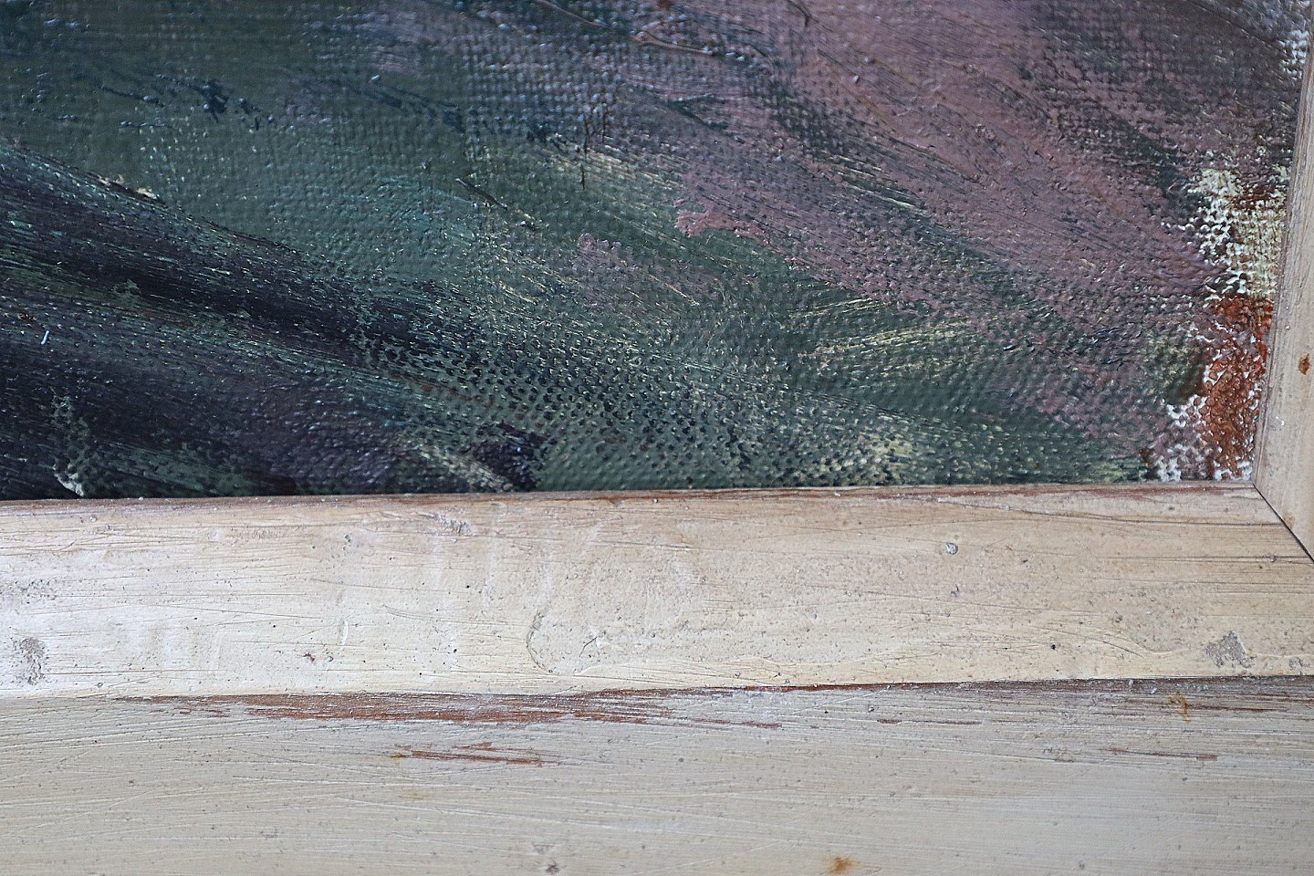 Maleri, ukendt kunstner. Skib der ligger til kaj. Maleriet er i bemalet træramme, der har enkelte brugsspor. Maleriet er usigneret.