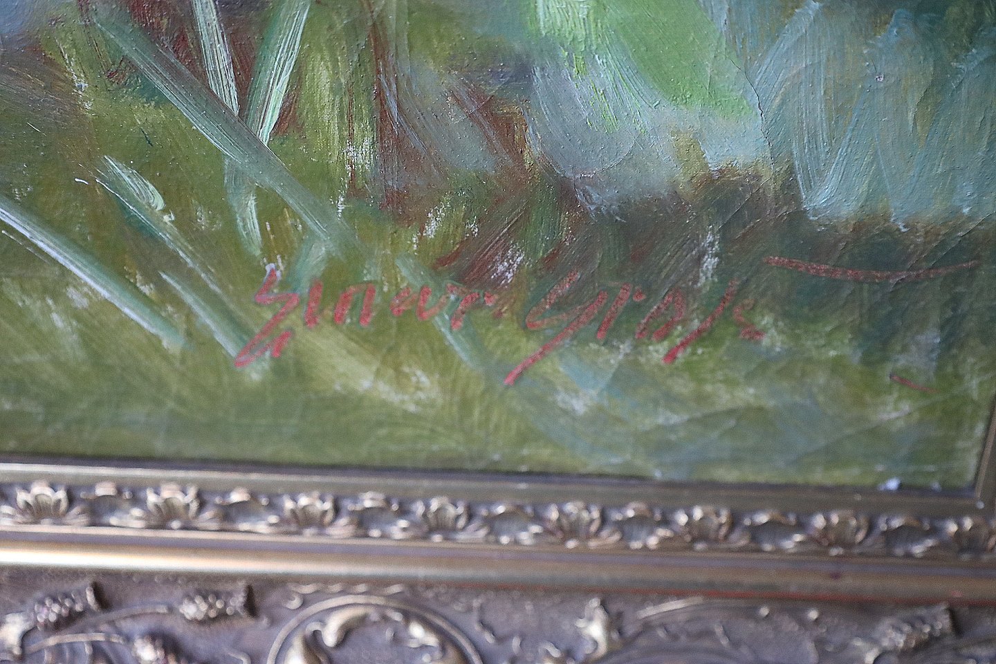 Billedet er i ornamenteret guldramme, rammen har dog få brugsspor