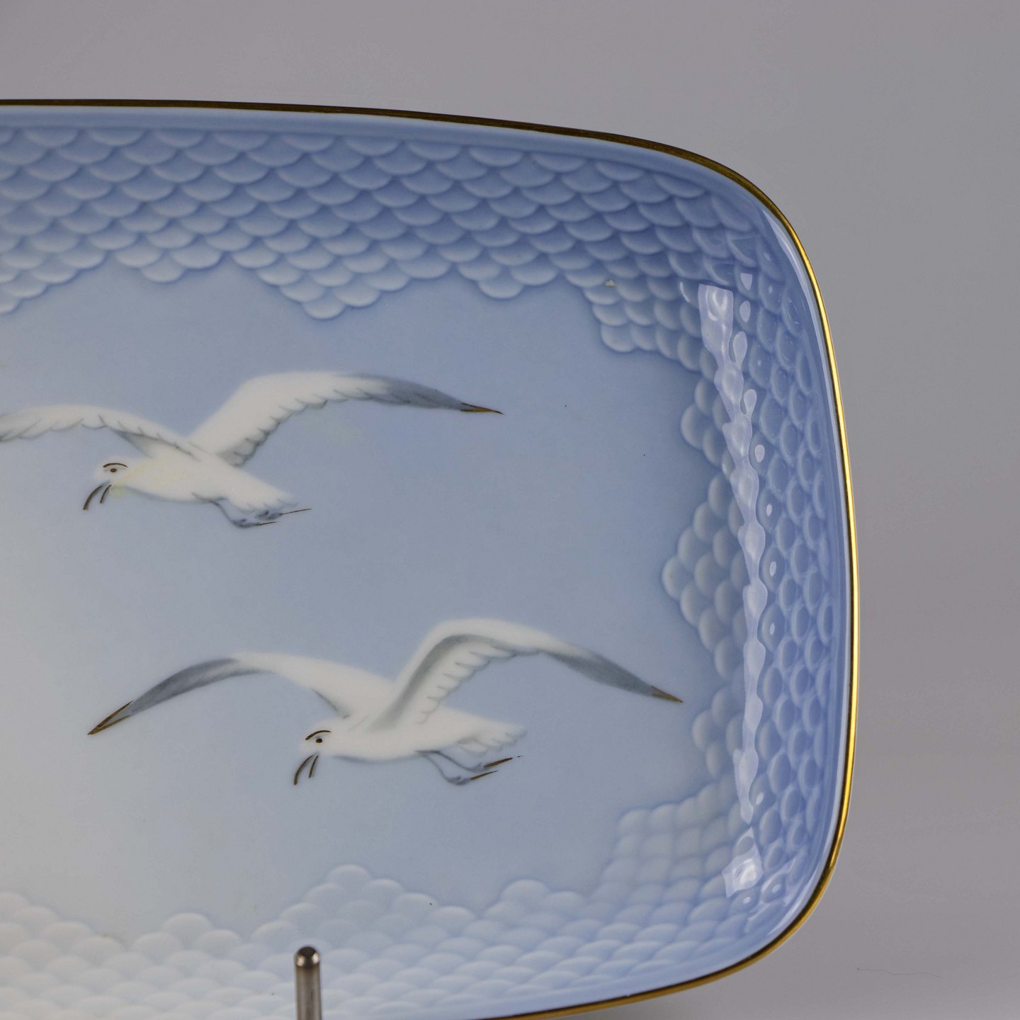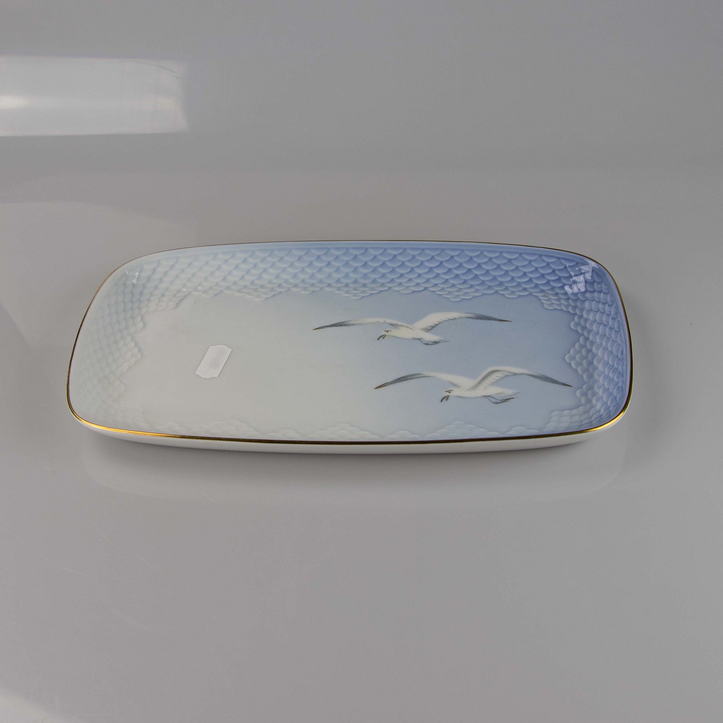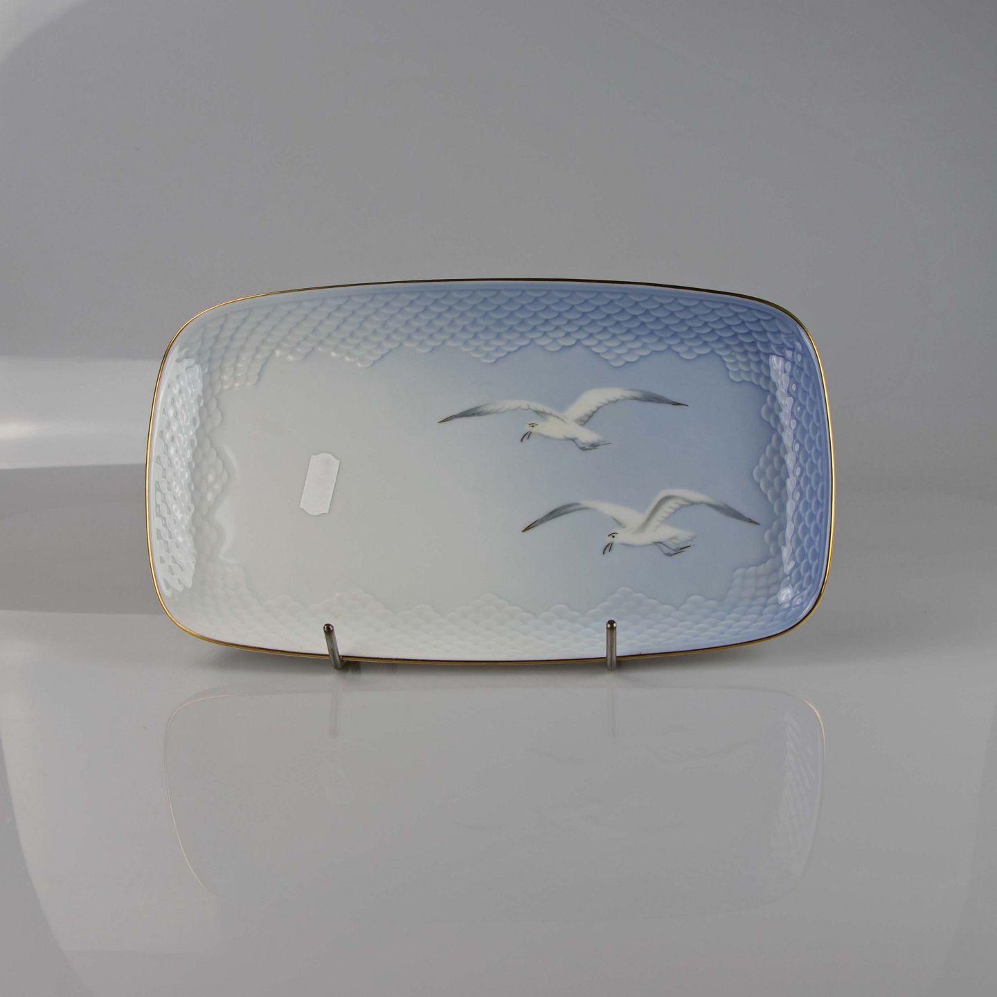 Fad fremstillet i porcelæn med skelform i gradueret blå nuancer med guldkant samt motiv af måge.