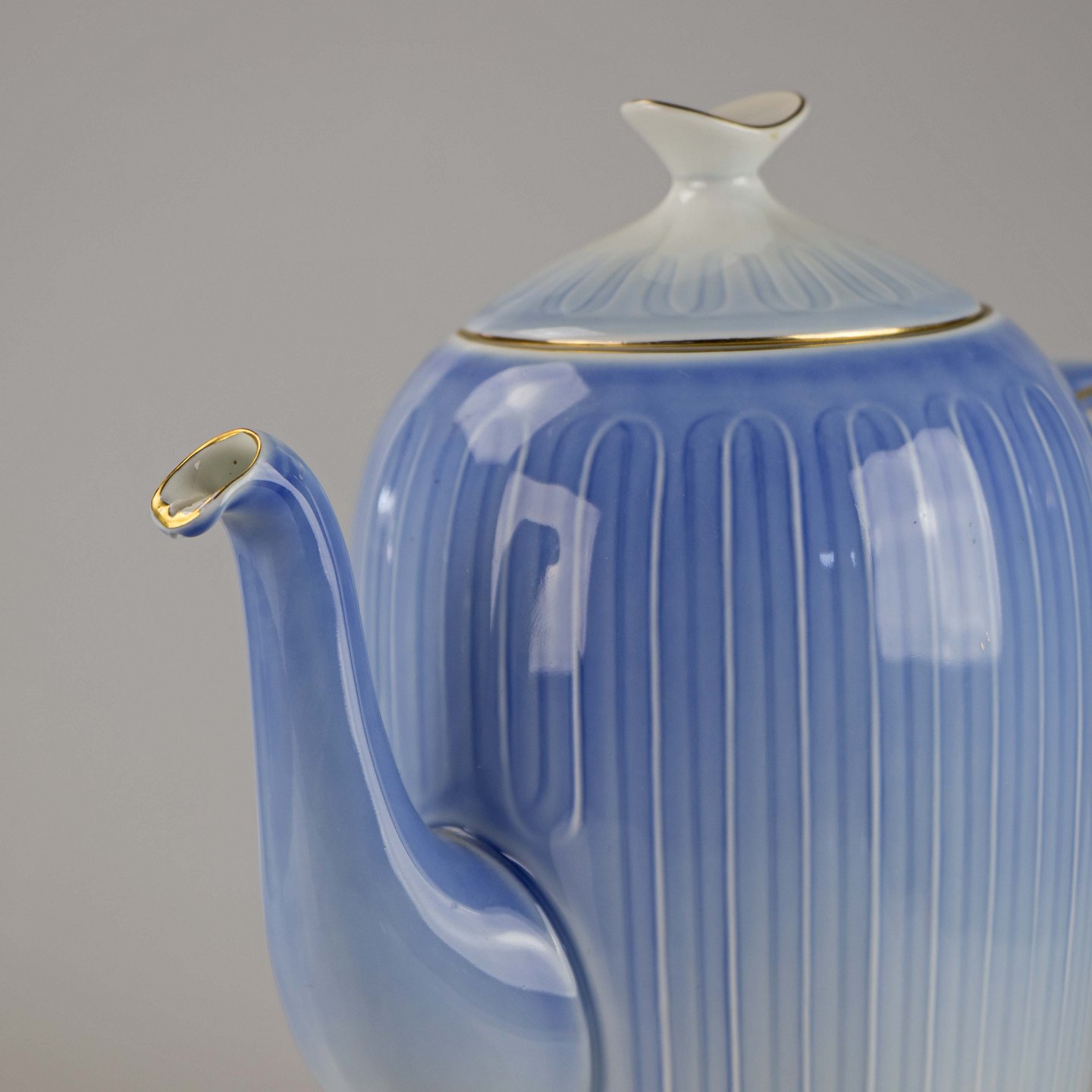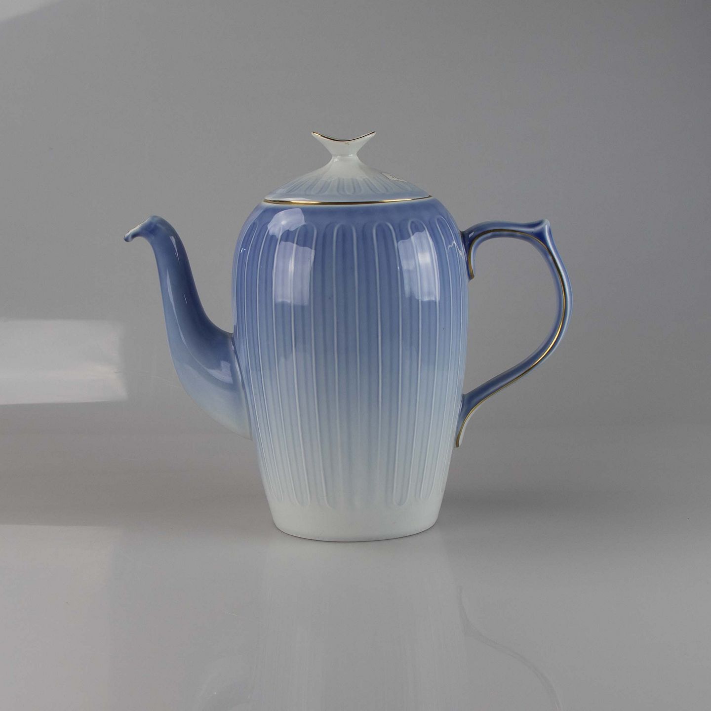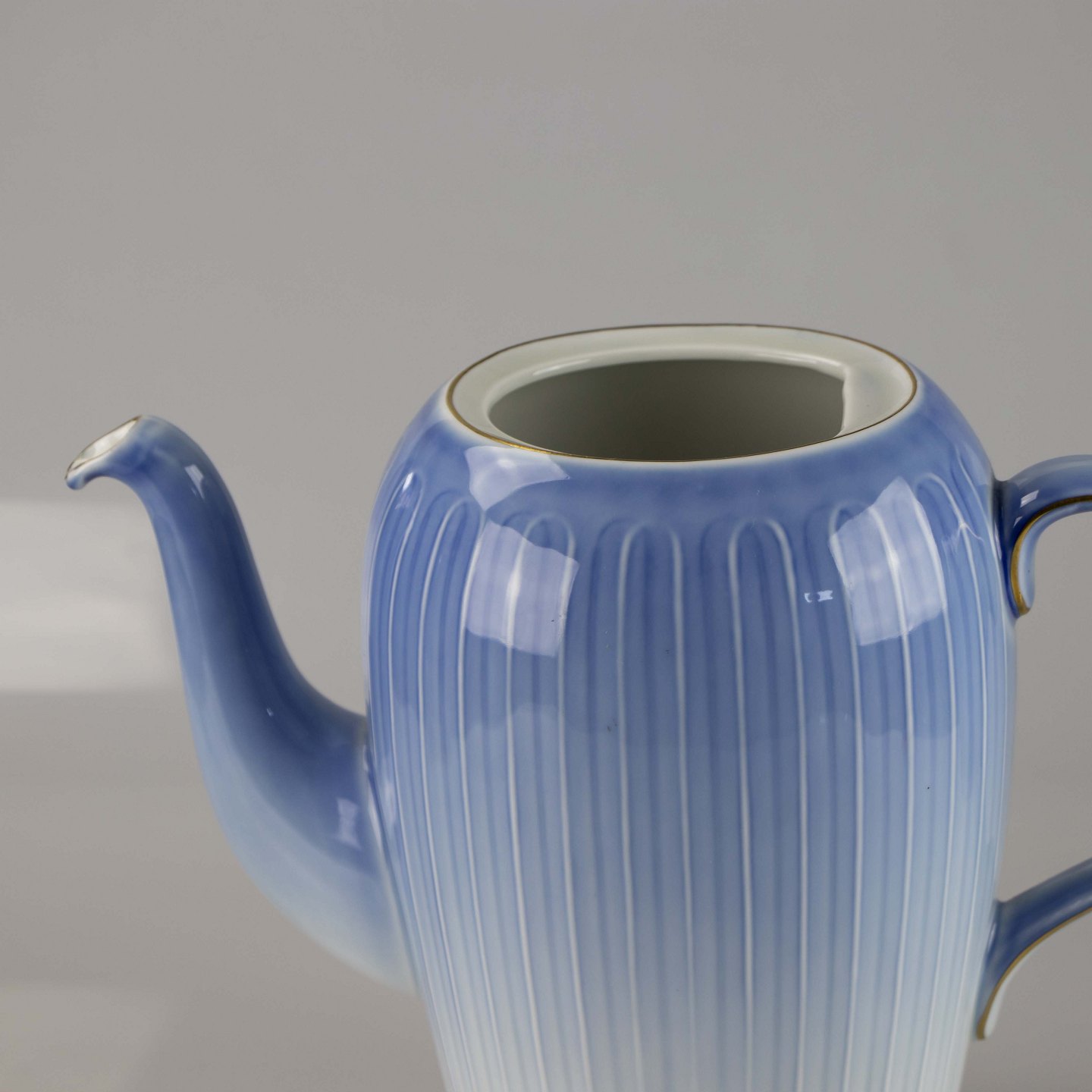 Kande fremstillet i porcelæn med stribet motiv i gradueret blå nuancer.