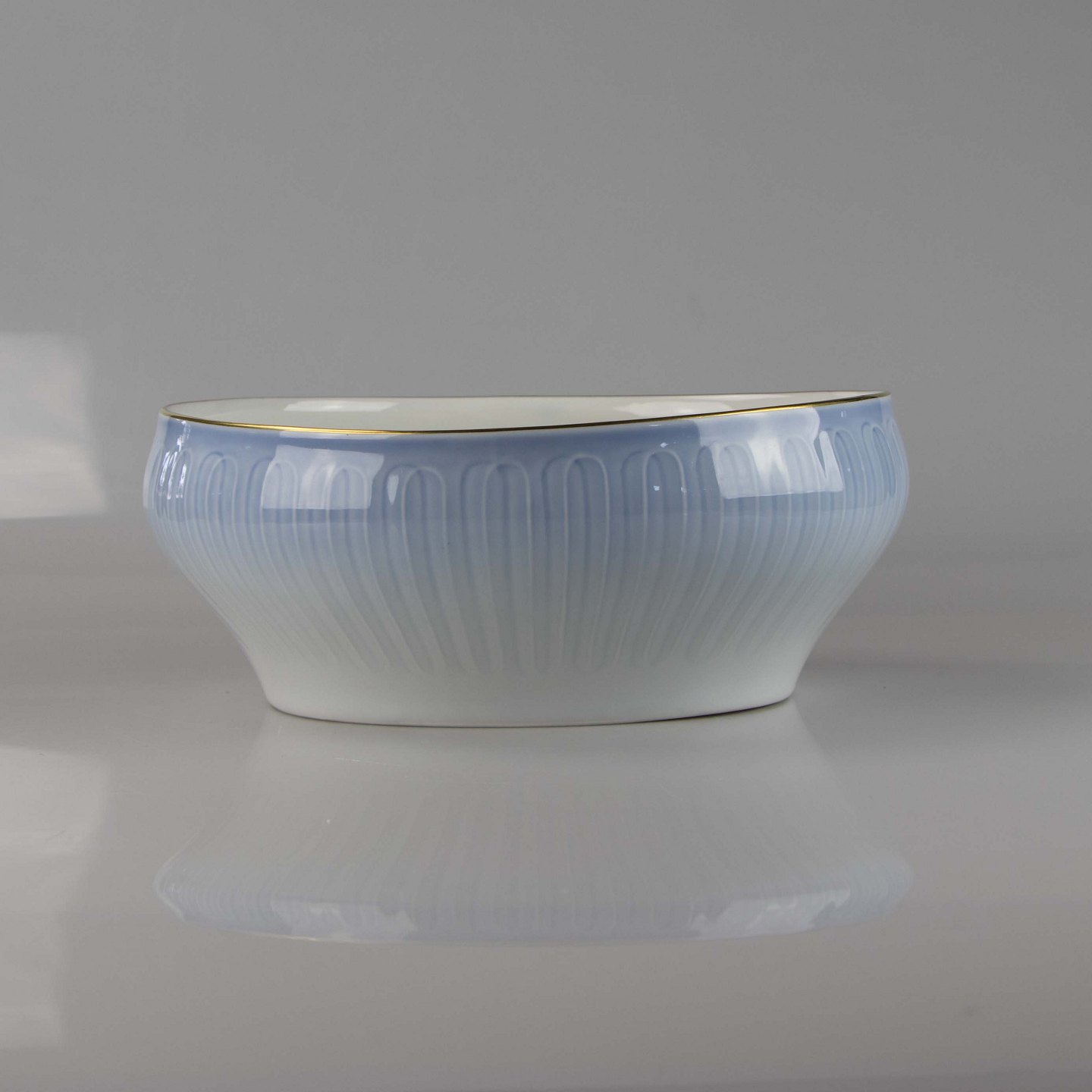 Skål fremstillet i porcelæn med stribet motiv i gradueret blå nuancer.