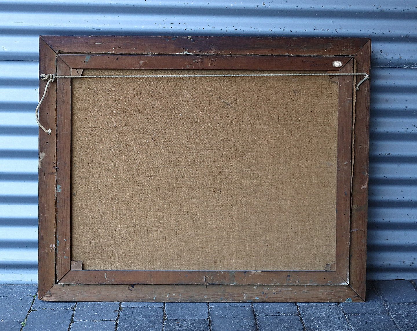 Maleri, Aage Bernhard Frederiksen (1883-1963). Parti af vej, i tøvejr, der ligger et rødt hus ved den ene side af vejen. Signeret B.F.. Maleriet er i en mørk guldramme, der har enkelte brugsspor