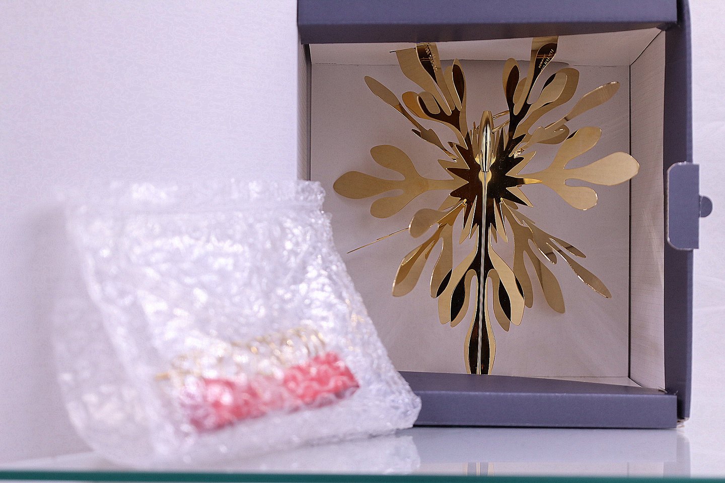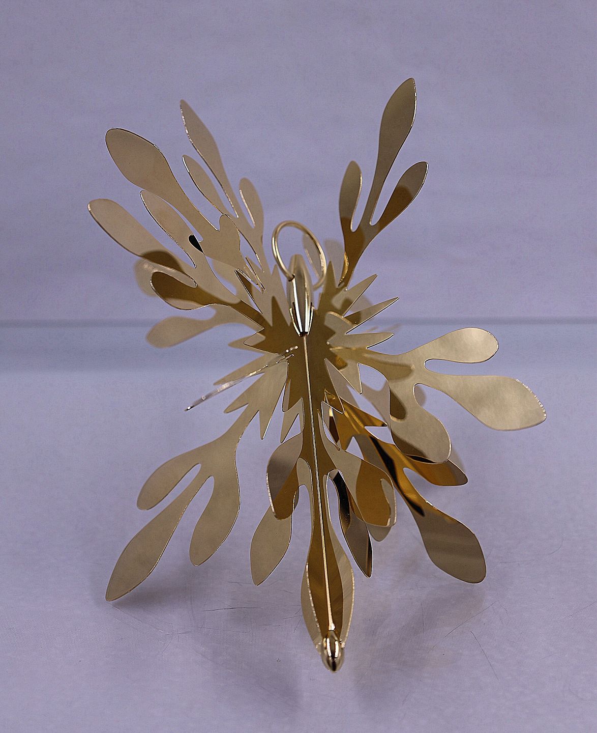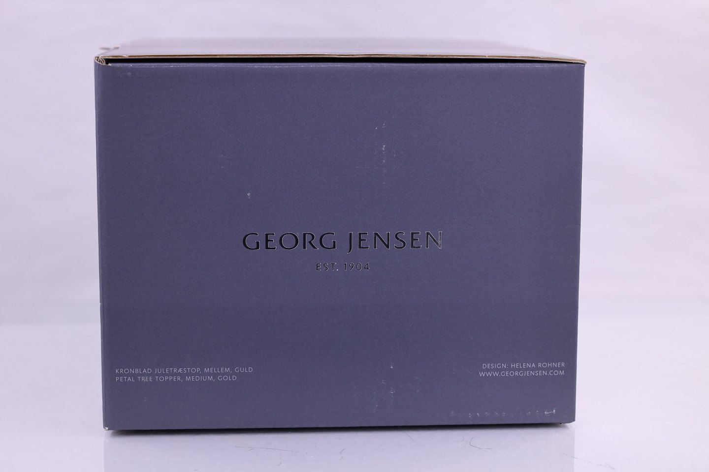 Georg Jensen. Kronblad topstjerne 2016, topstjernen kan både sættes på toppen af juletræet eller hænge. Kronblad topstjernen er mellem størrelse. Topstjernen er messing belagt med 18 karat guld, og kommer i original æske, der er også et rødt ubrugt bånd med, der følger juletræs holder med.
