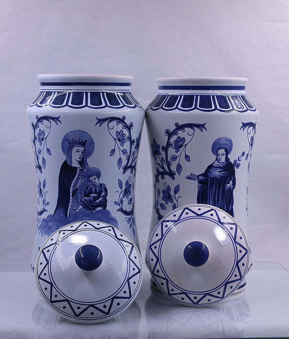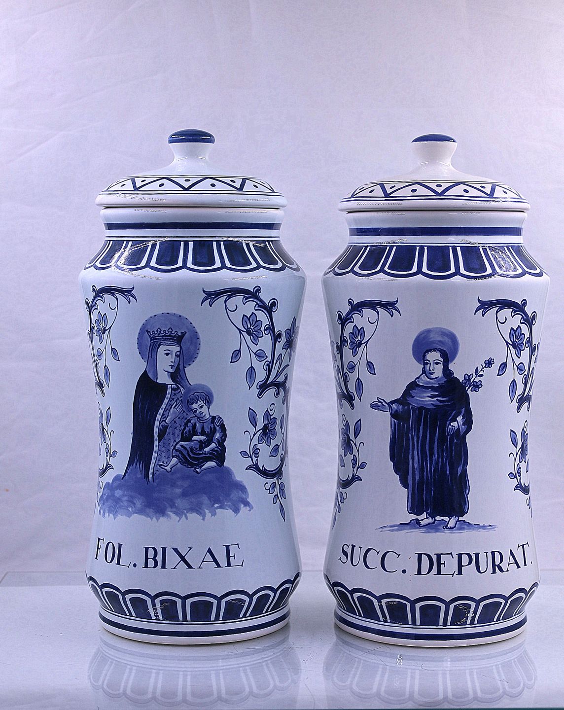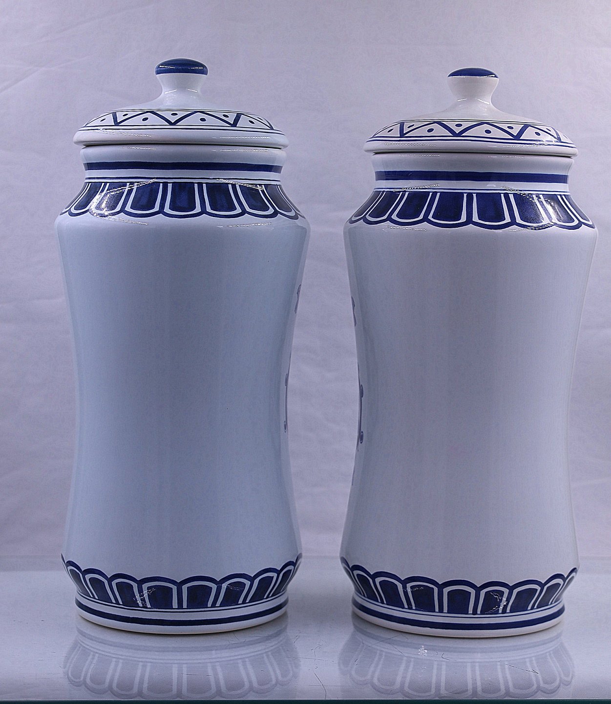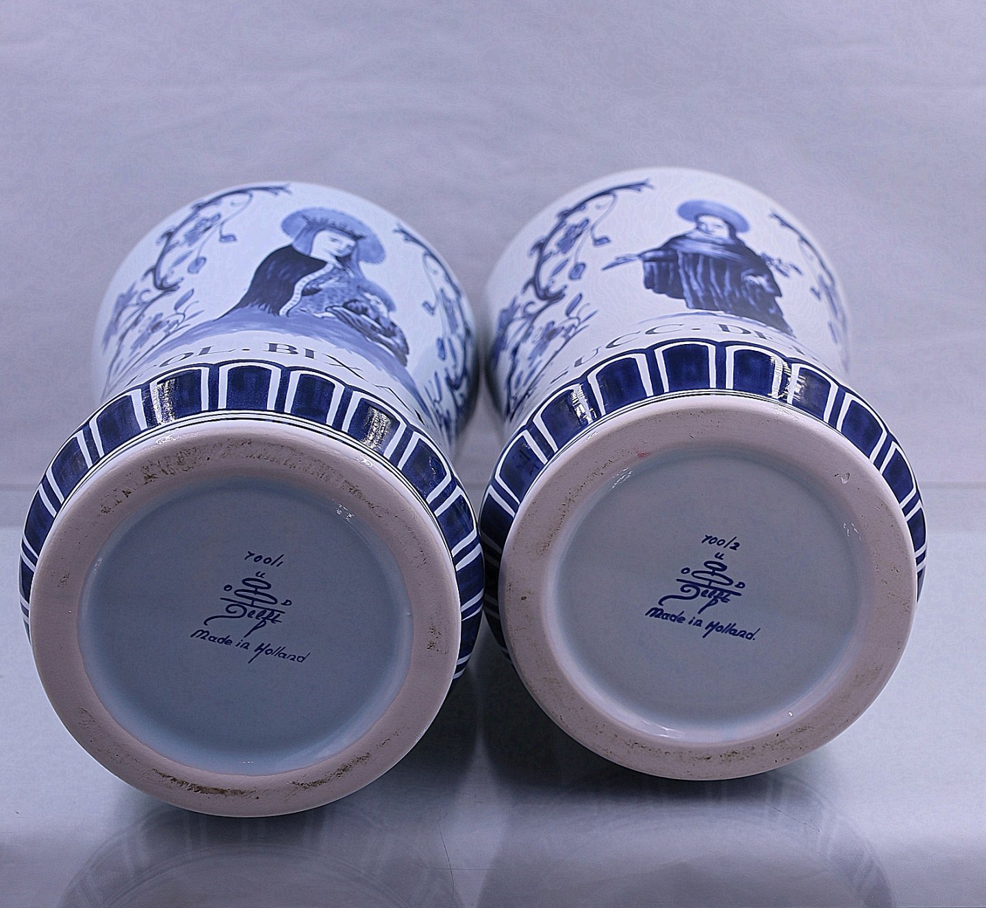 Delft apotekerkrukker, nr 700/1 og 700/2. Hollandske apotekerkrukker fra Delft, krukkerne er med låg. Delfterfajance, hollandsk fajance, fremstillet i byen Delft. Fra 1500-tallet blev der produceret fajance i Holland, og værkstederne i Delft var førende fra midten af 1600-tallet til ca. 1725.