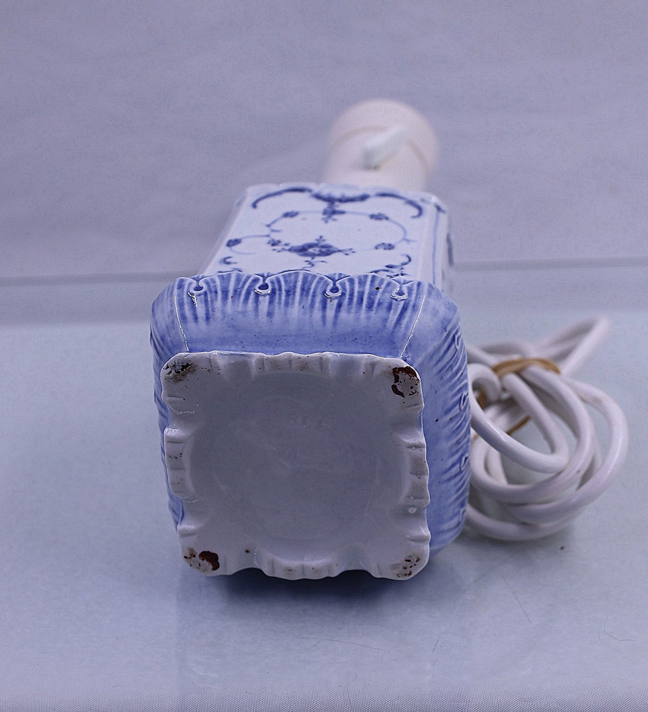 Bordlampe musselmalet, lampen er af porcelæn. Lampen er 4-kantet, der sidder afbryder på selve lampen.