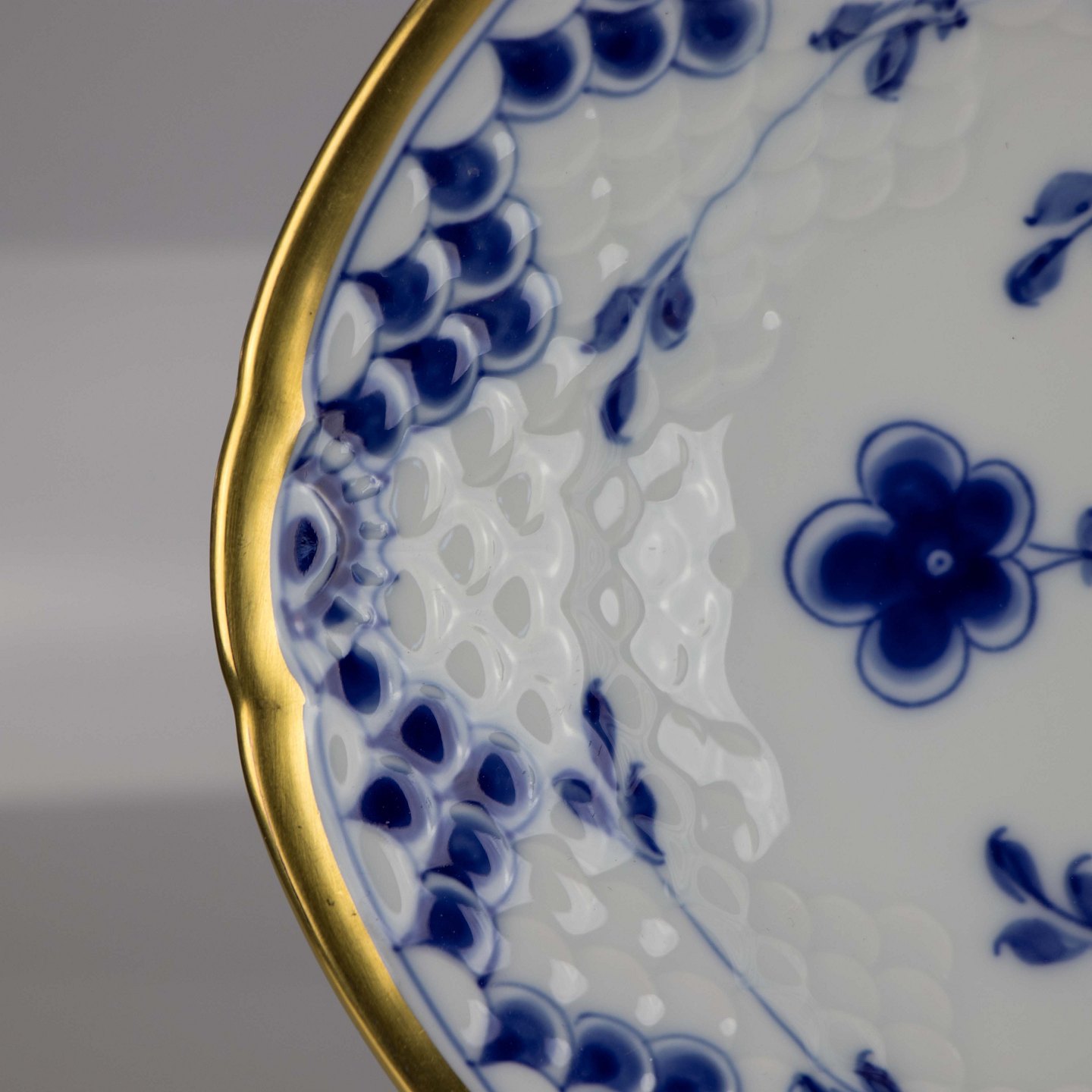 Fad i hvidt porcelæn med guldkant med blå motiver af blomster og sommerfugle.