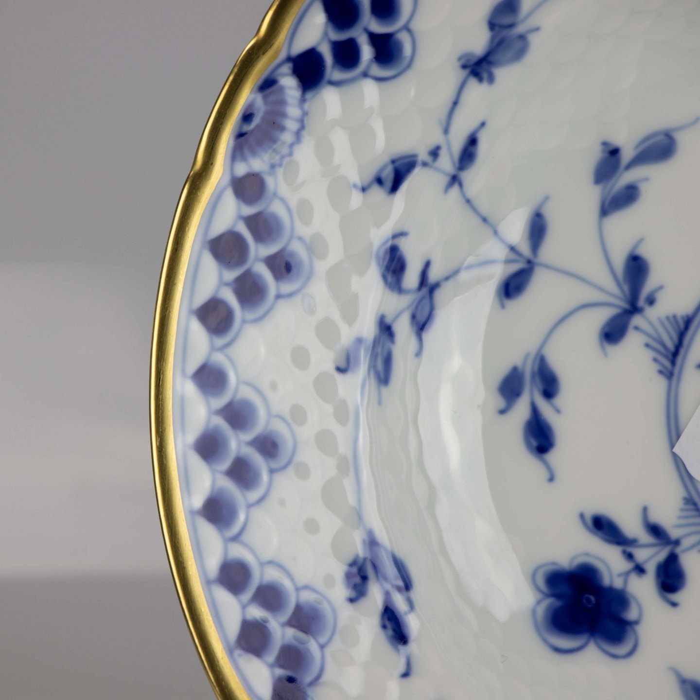 Tallerken i hvidt porcelæn med guldkant med blå motiver af blomster og sommerfugle.