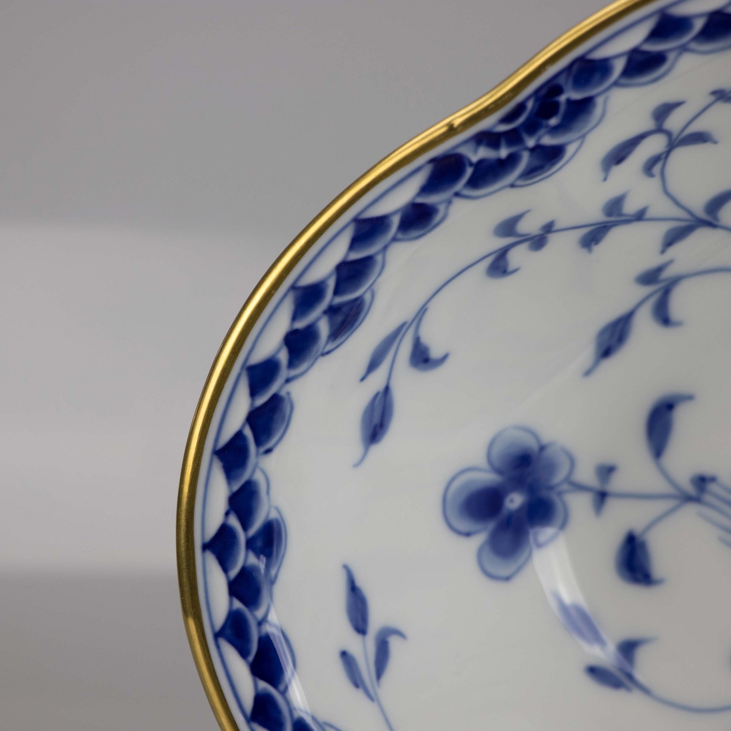 Skål i hvidt porcelæn med guldkant med blå motiver af blomster og sommerfugle.