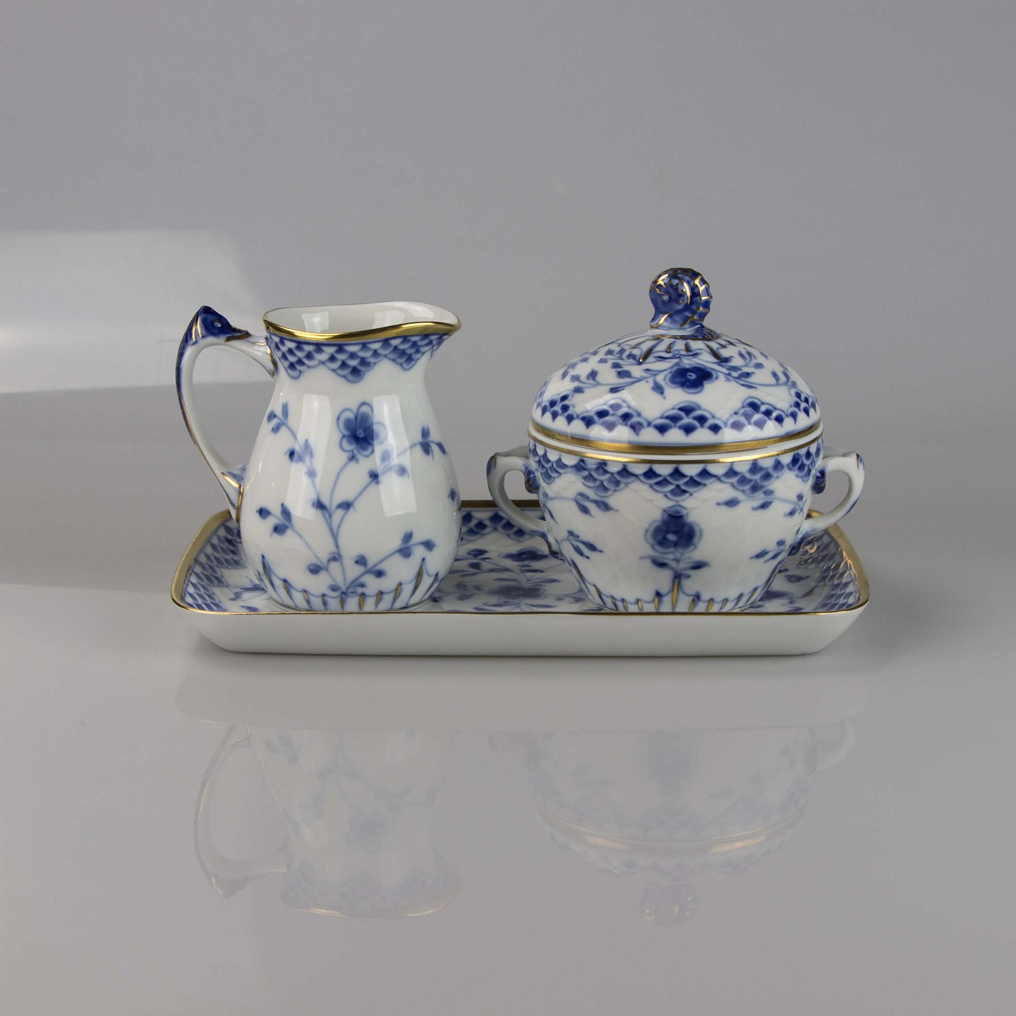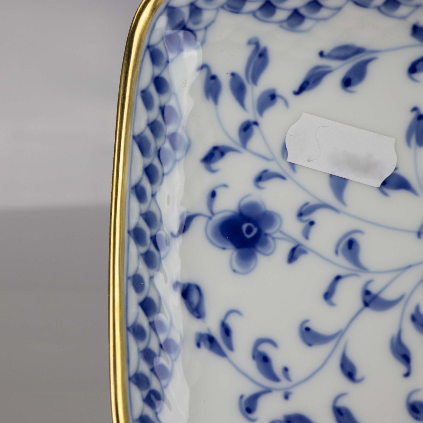 Fad i hvidt porcelæn med guldkant med blå motiver af blomster og sommerfugle.