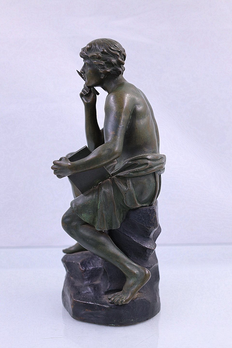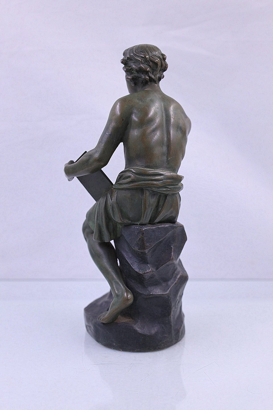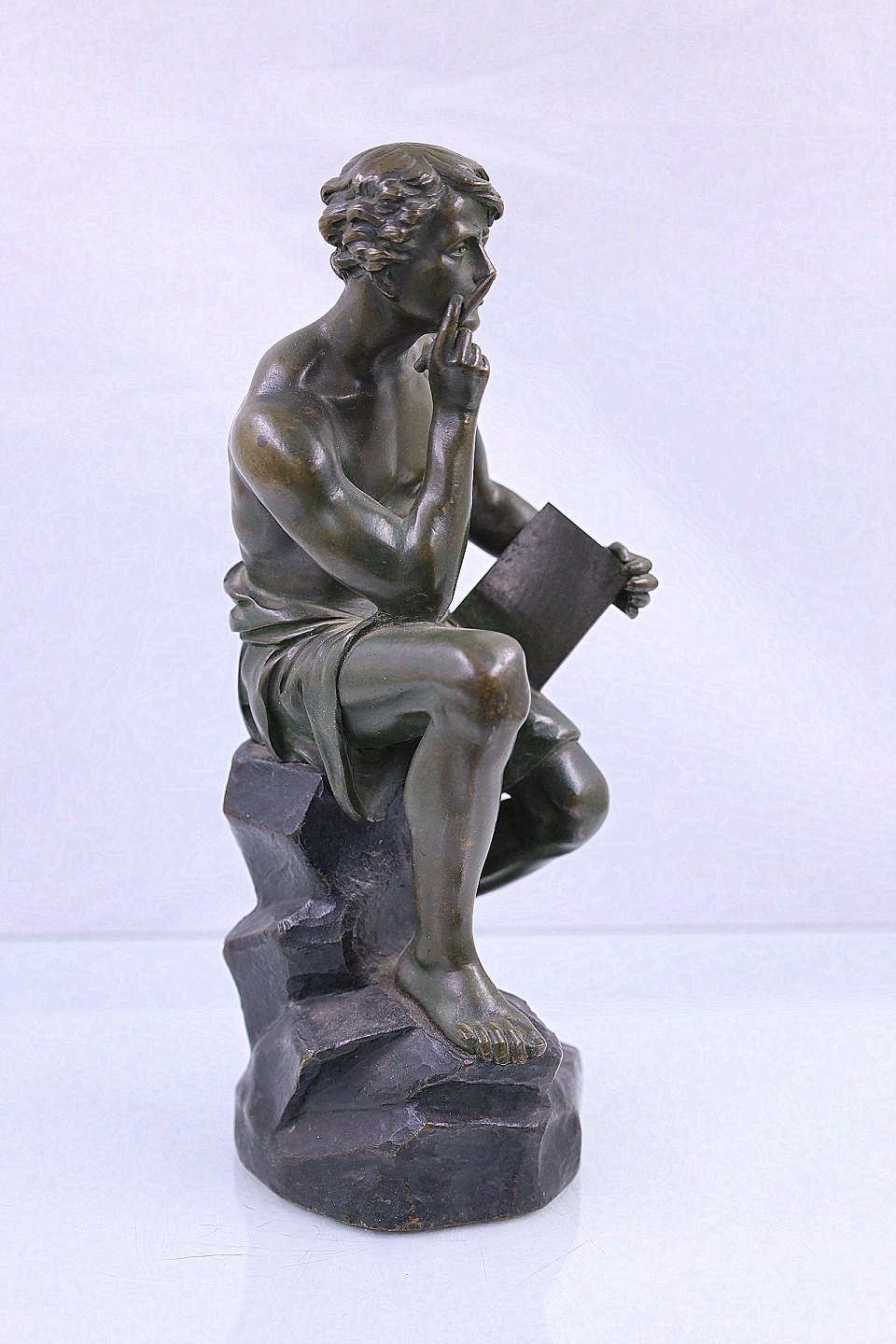 S. Carlier. Bronze mand, der sidder med pen og blok. Figuren er udført efter "Grubleren" af Auguste Rodin.