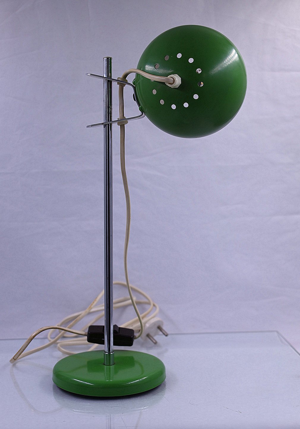Grøn bordlampe, kuglemodel. Lampen er af metal, grønlakeret yderst og på lampefod, hvidlakeret inderst. Stammen er forniklet metal. Kuglehovedet kan justeres via en klips på stammen