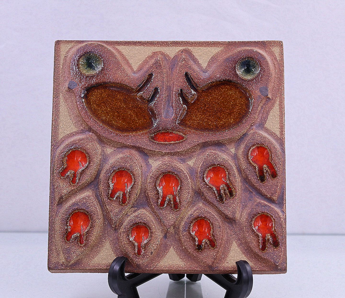 Søholm Keramik. Relief, nr. 3574-6. 2 brune fantasi fugle med bladformede motiver nedenunder.