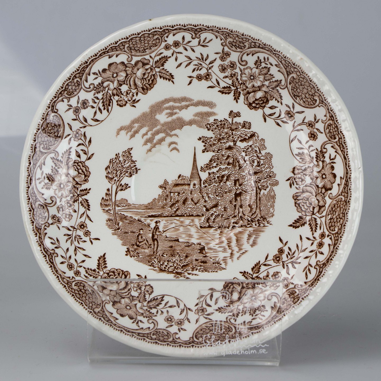Kop i lys fajance med brunfarvet landsbymotiv.
