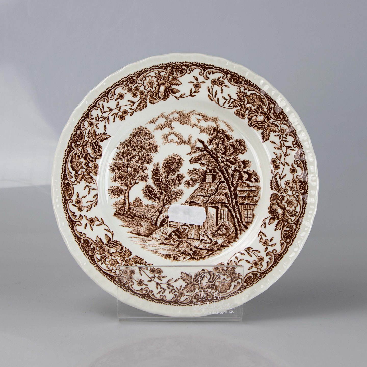 Tallerken i lys fajance med brunfarvet landsbymotiv.