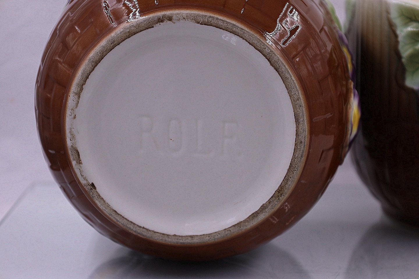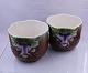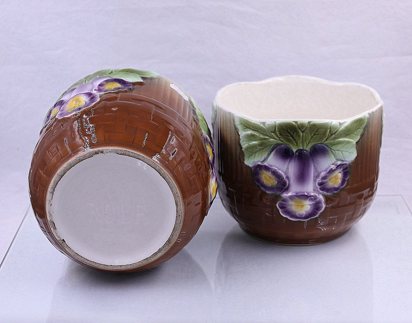 Majolika fajance urtepotteskjulere. Der er stemplet ROLF i bunden af skjulerne. Potteskjulerne er brunlige med lilla klokkeblomster, som dekoration. Der er brugsspor efter brug indvendig