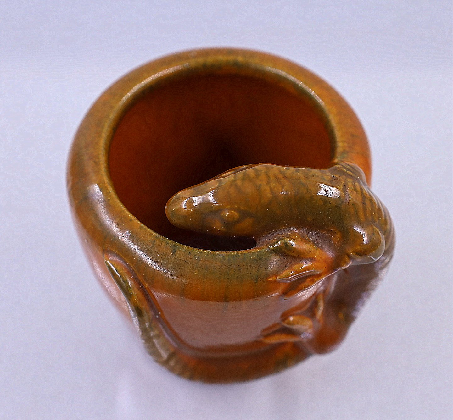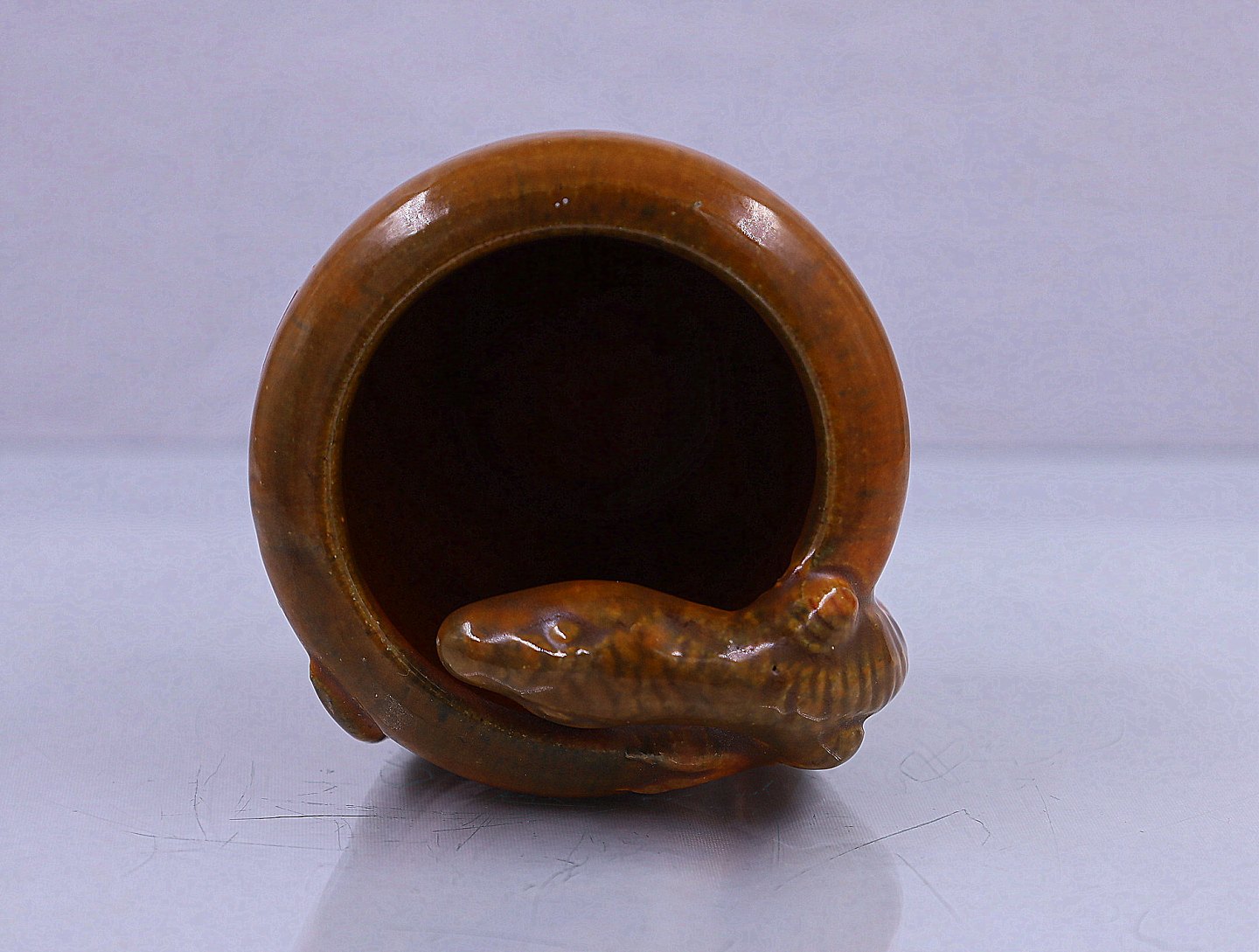Brunlig vase mede gekko, som dekoration. Vasen er af keramik. Vasens facon er konkav. Vasens oprindelse ukendt, der er ingen skår og afslag på vasen