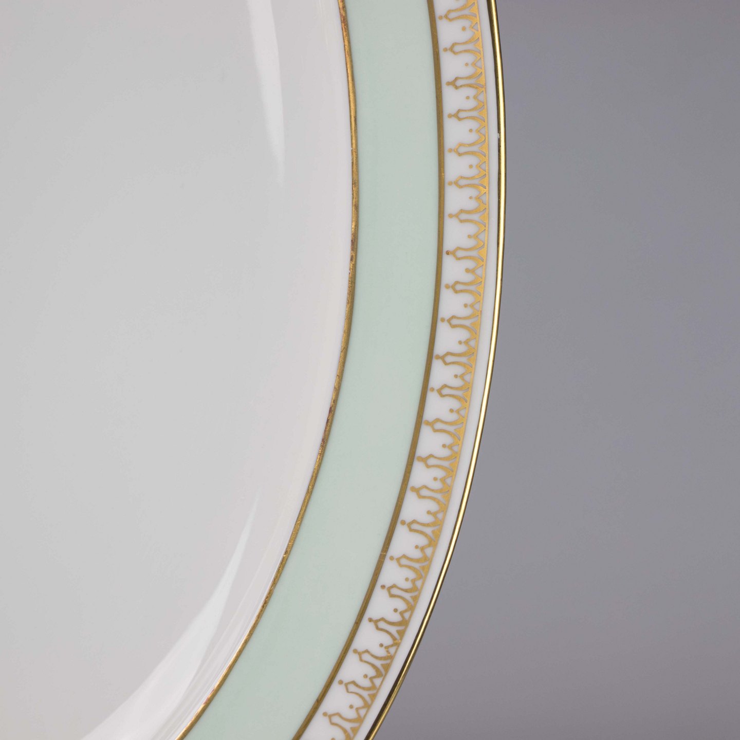 Fad i hvidt porcelæn med lysegrøn kant og gylden dekoration