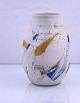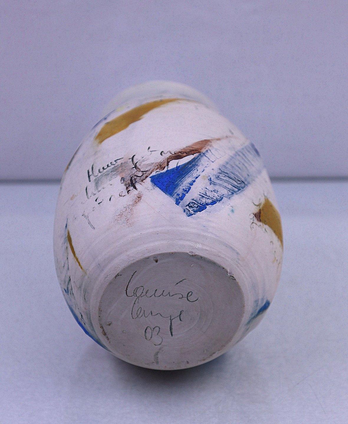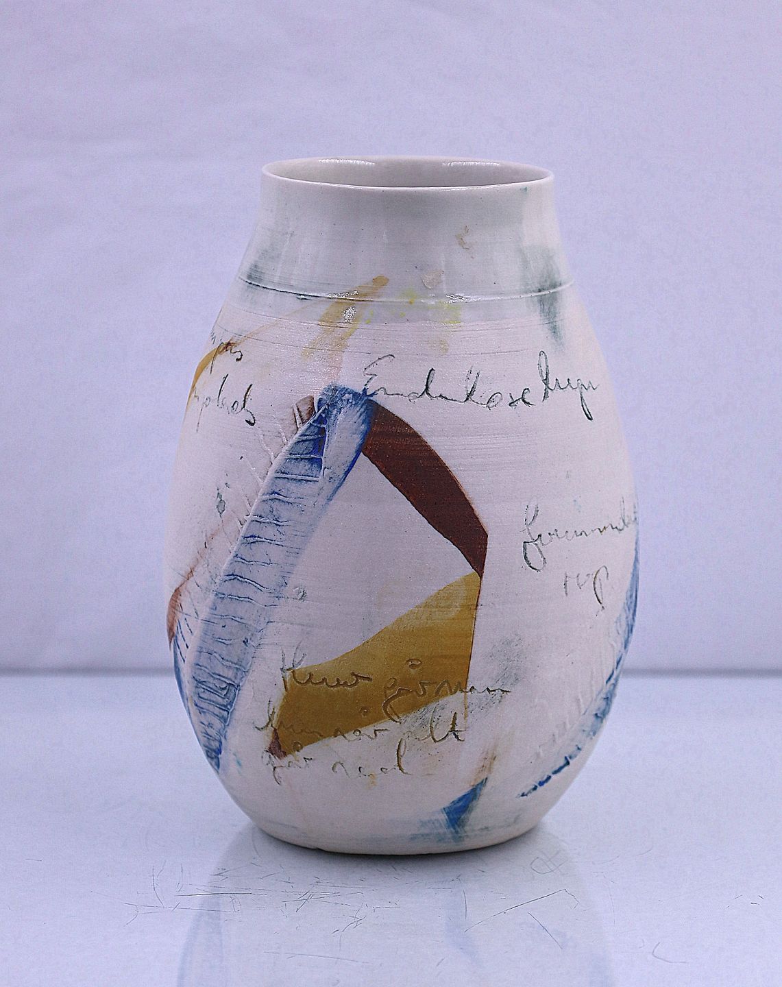 Louise Lange, Hjelmerstad, Aalborg. Vase i keramik, dekoreret med citater på forskellige sprog, samt glasur i brun og blå farver, indvendig hel glasur. Signeret Louise Lange 03