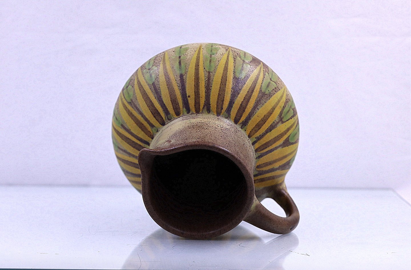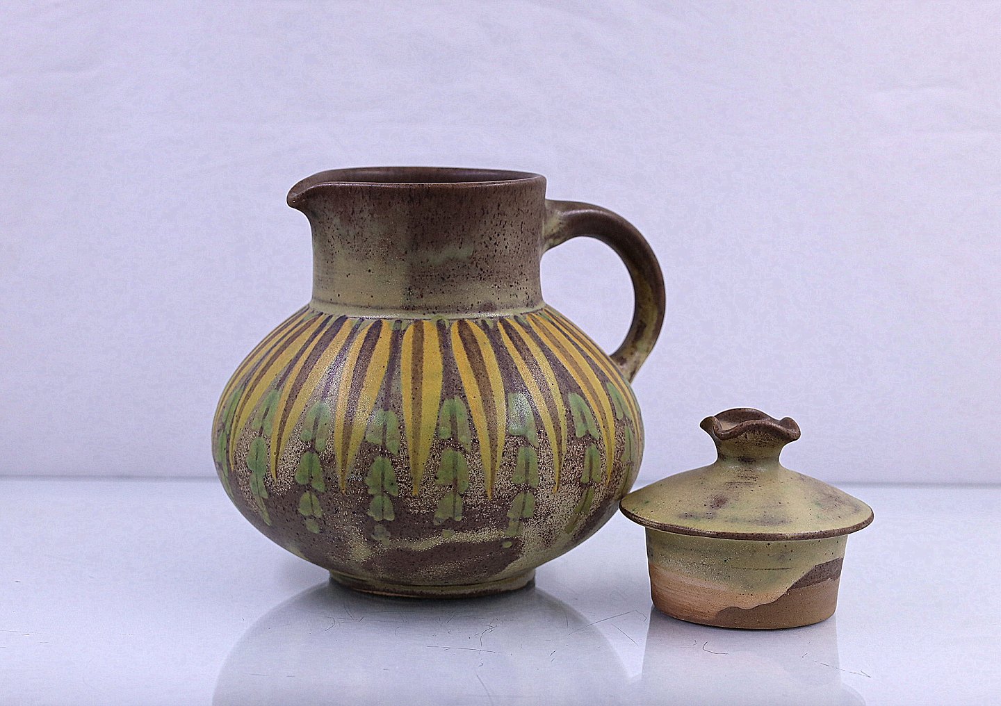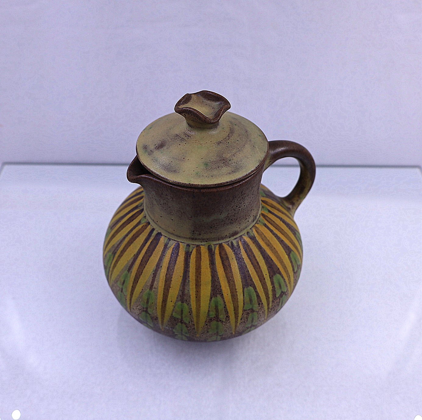 Dybdahl Keramik. Tekande med låg. Tekanden er grøn med gule blade.