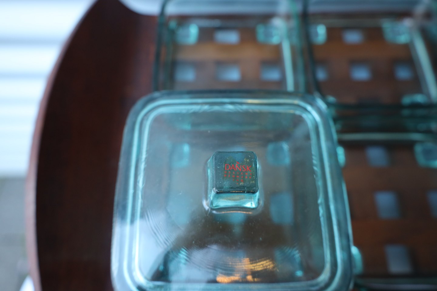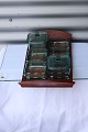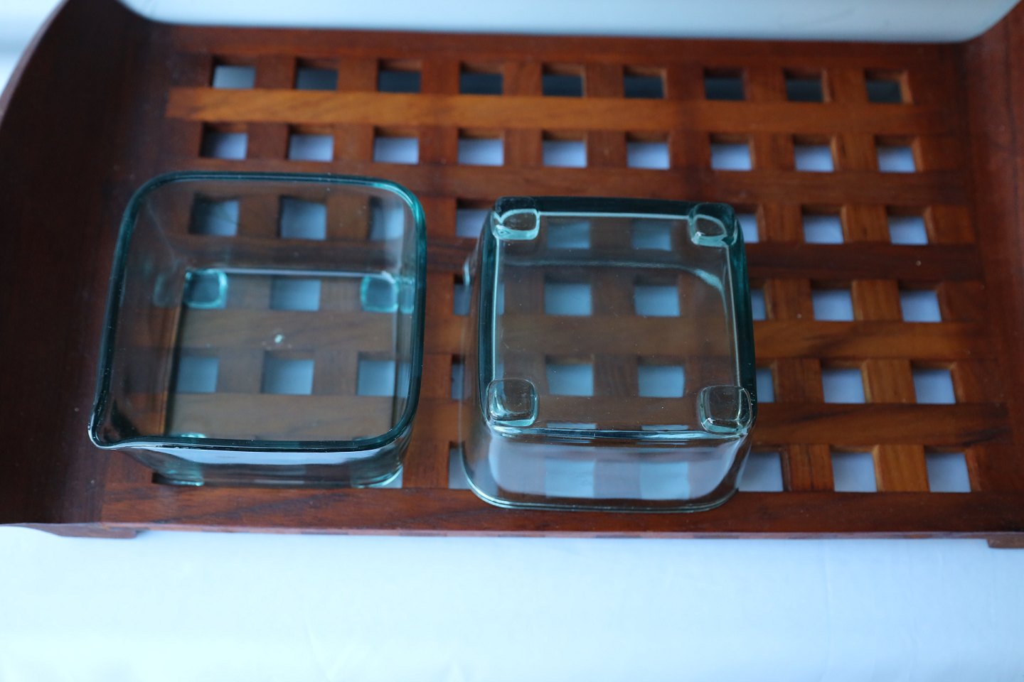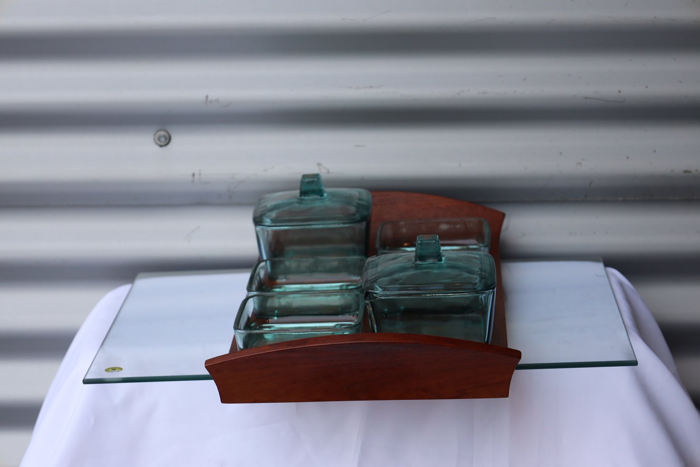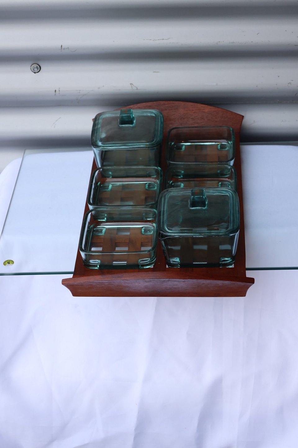 Jens Harald Quistgaard = IHQ. Dansk Design. Vintage bakke, i teak træ, med 6 glasskåle, 2 af skålene har hælde tud og låg. De 6 skåle er grønlige, hver skål har "fødder" der passer i bakkens gitter. Bakken er designet 1960`erne.
