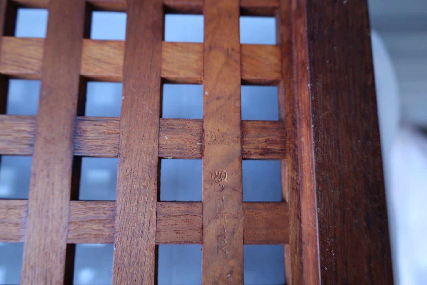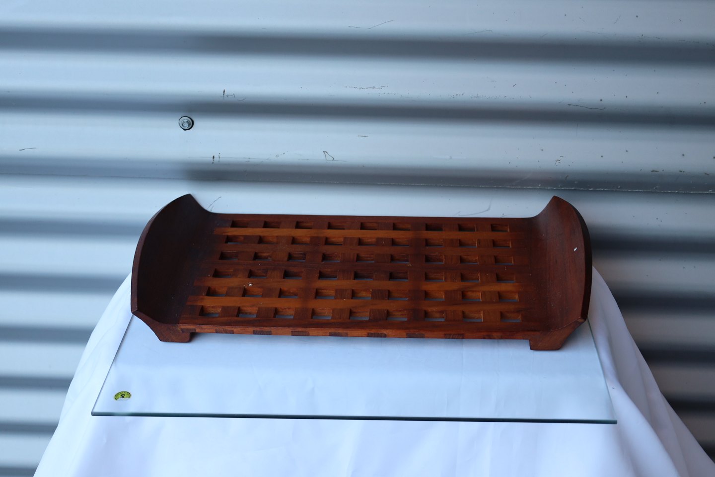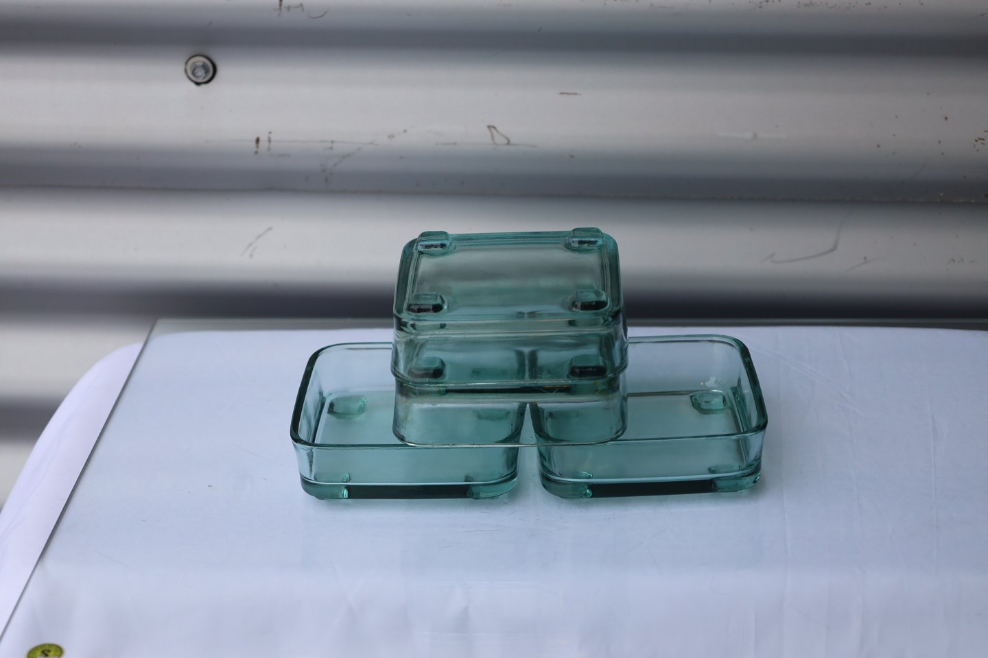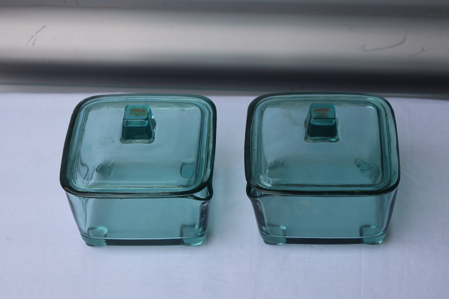 Jens Harald Quistgaard = IHQ. Dansk Design. Vintage bakke, i teak træ, med 6 glasskåle, 2 af skålene har hælde tud og låg. De 6 skåle er grønlige, hver skål har "fødder" der passer i bakkens gitter. Bakken er designet 1960`erne.