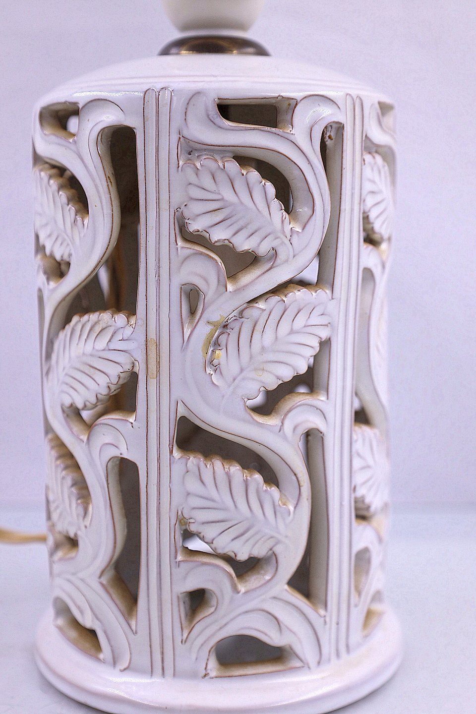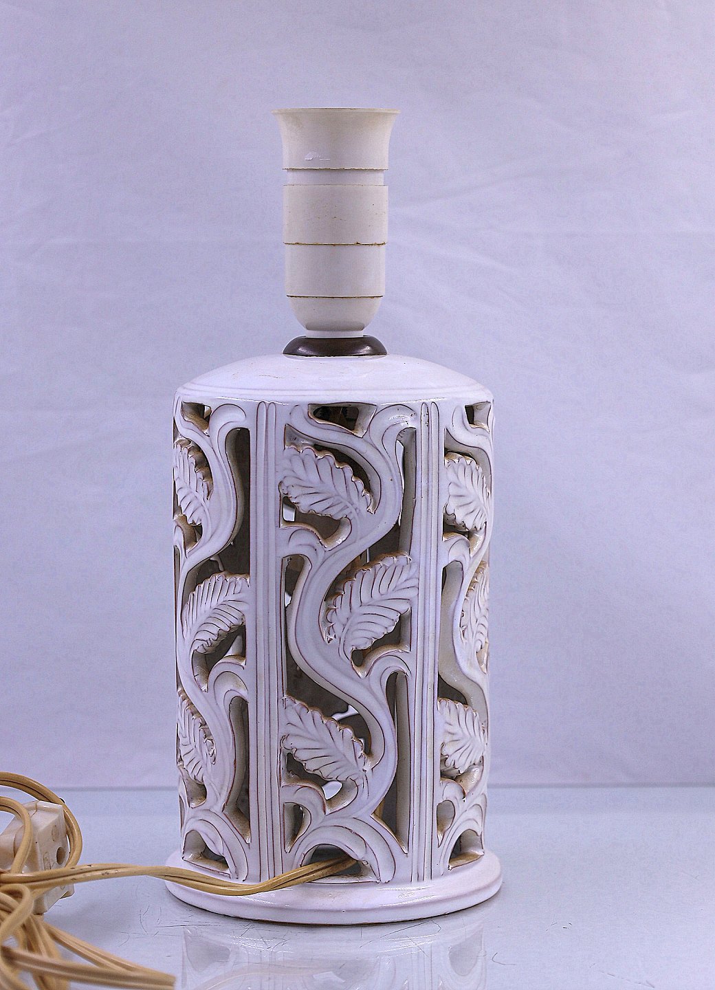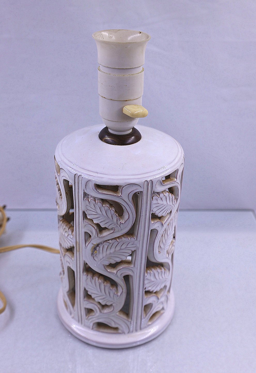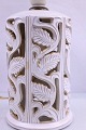 Hvid keramik bordlampe. Lampen er dekoreret med blade og hvid glaseret