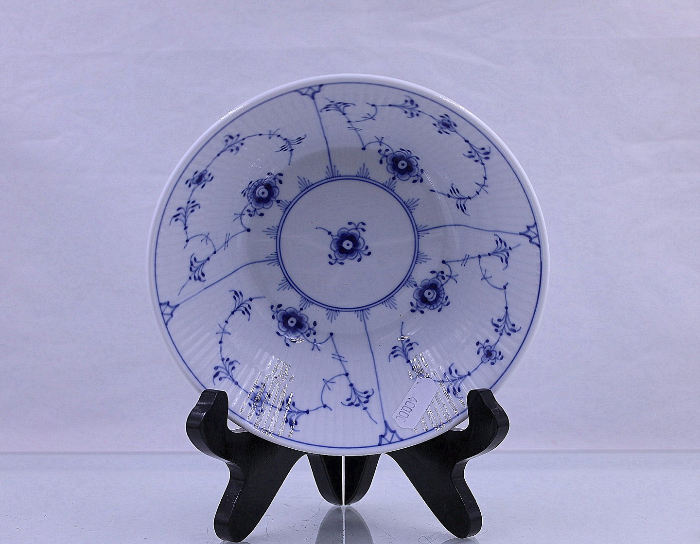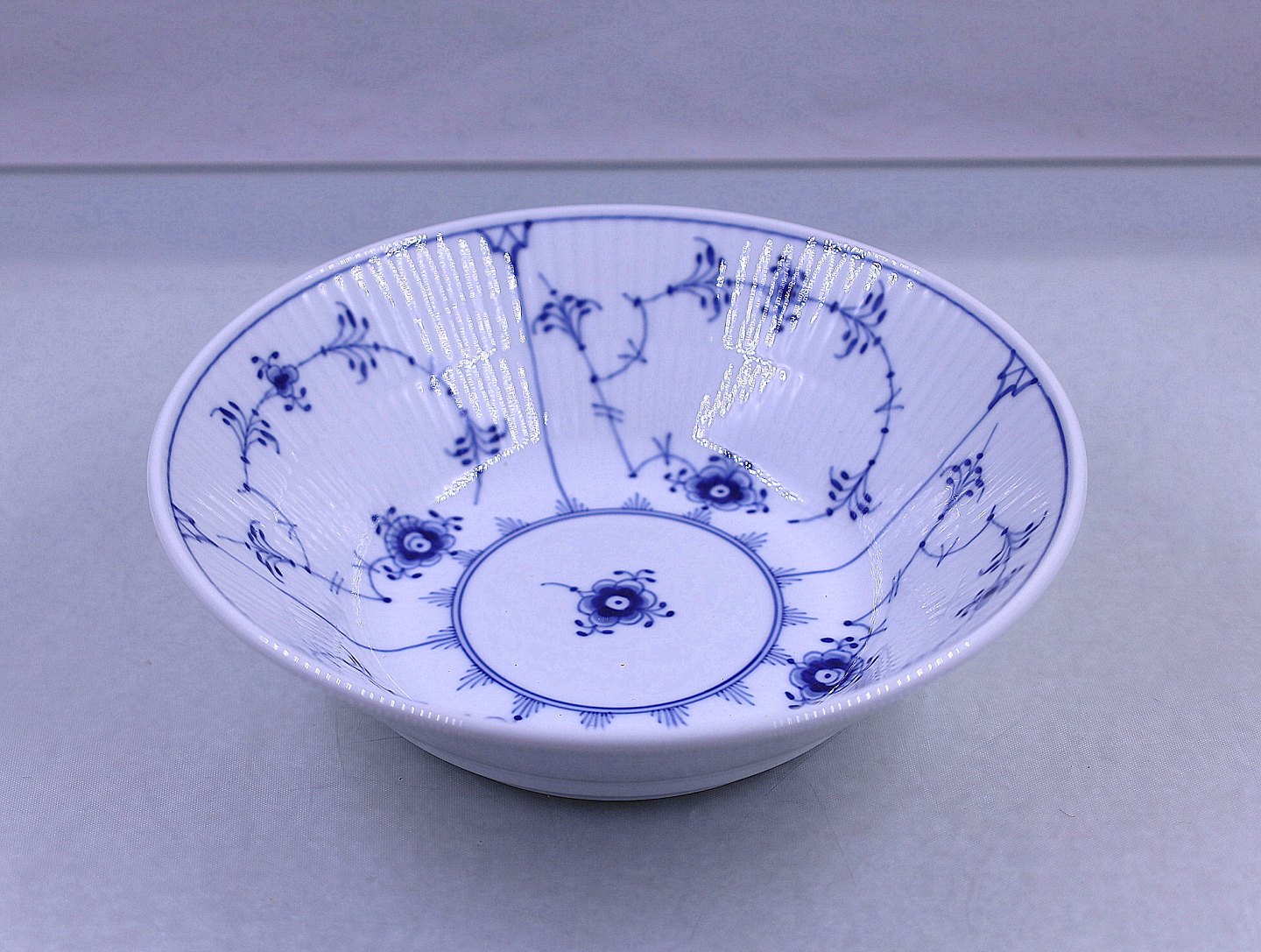 Royal Copenhagen. Musselmalet, riflet dyb tallerken eller ymerskål nr. 600. Tallerkenen er i de klassiske hvide og blå farver, håndmalet porcelæn