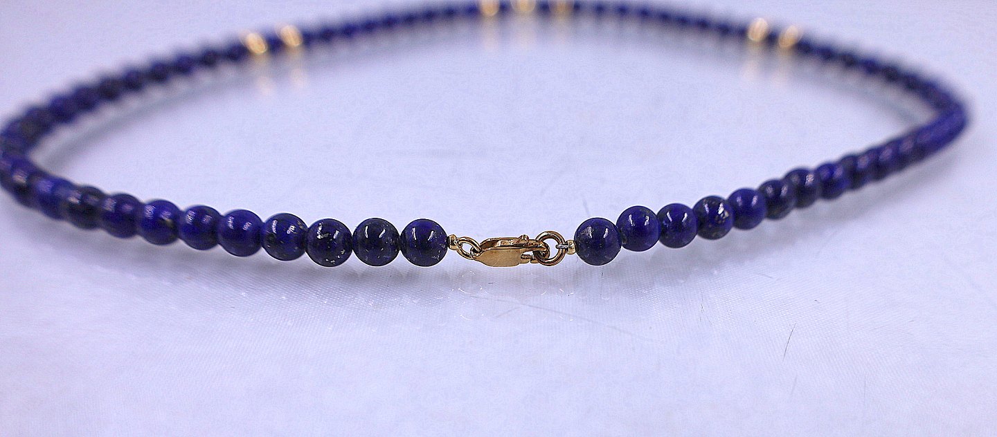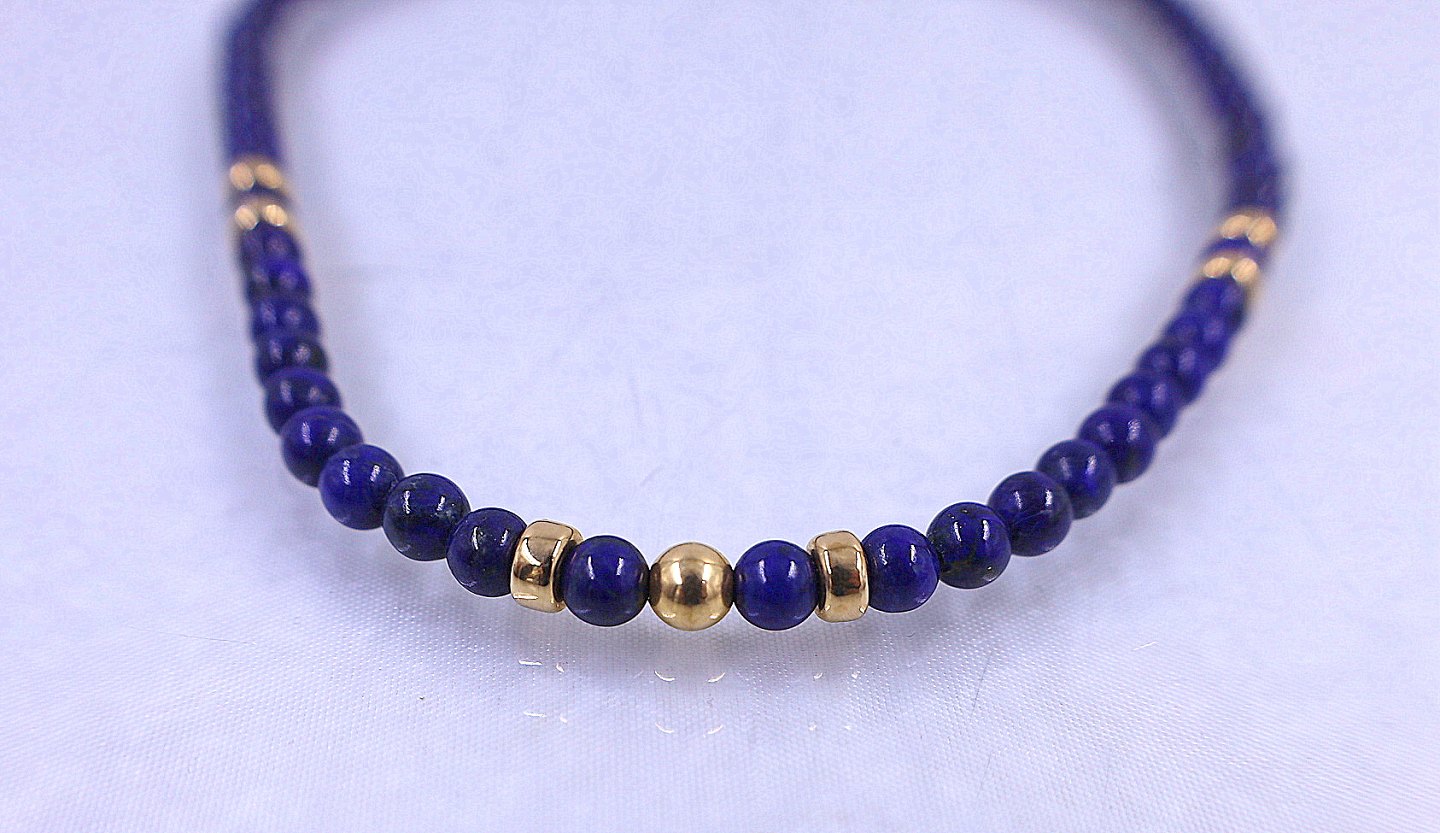 Halskæde, der består af perler i blåsafir og 14 karat guldperler, halskæden er lukket med fjederlås.