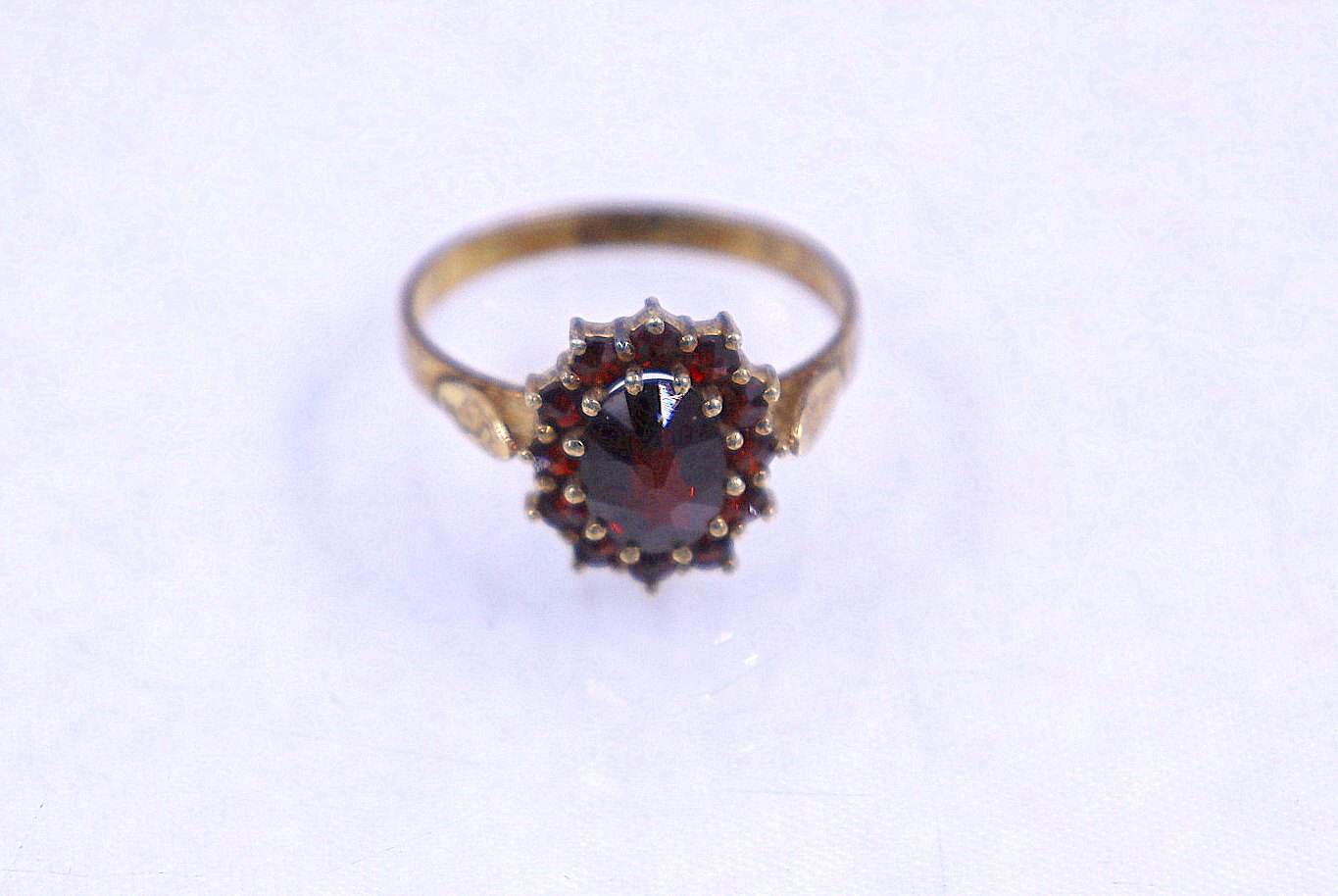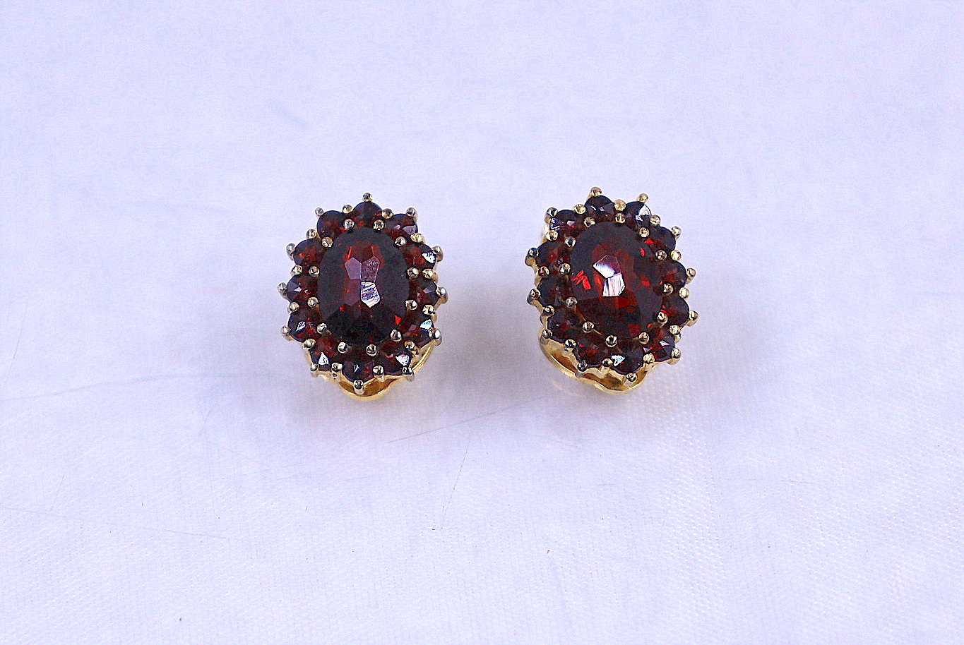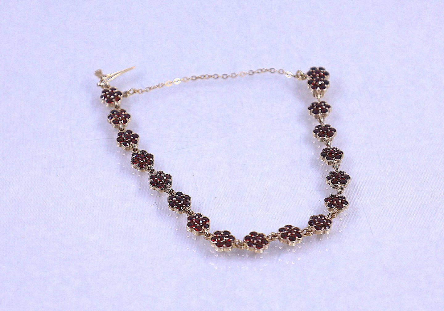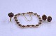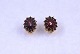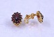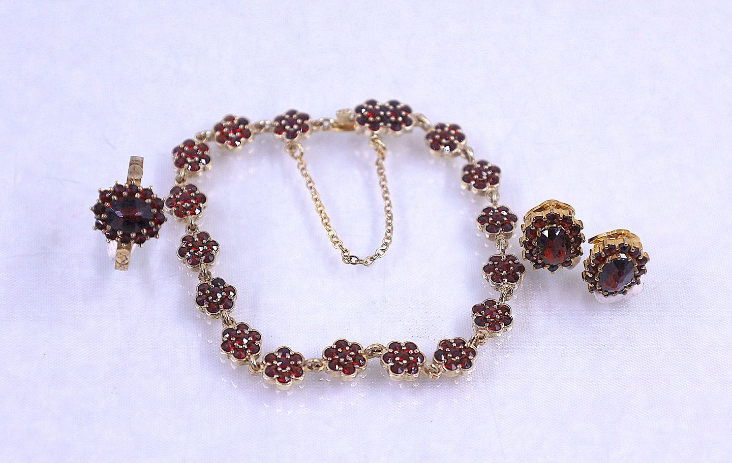 Johannes Aagaard. Granat smykkesæt, bestående af armbånd med sikkerhedslås, ring str. 54, og 2 øreclips. Sættet er forgyldt sølv