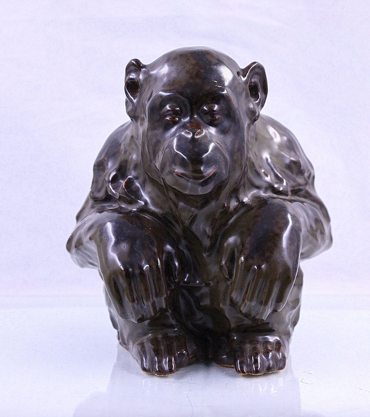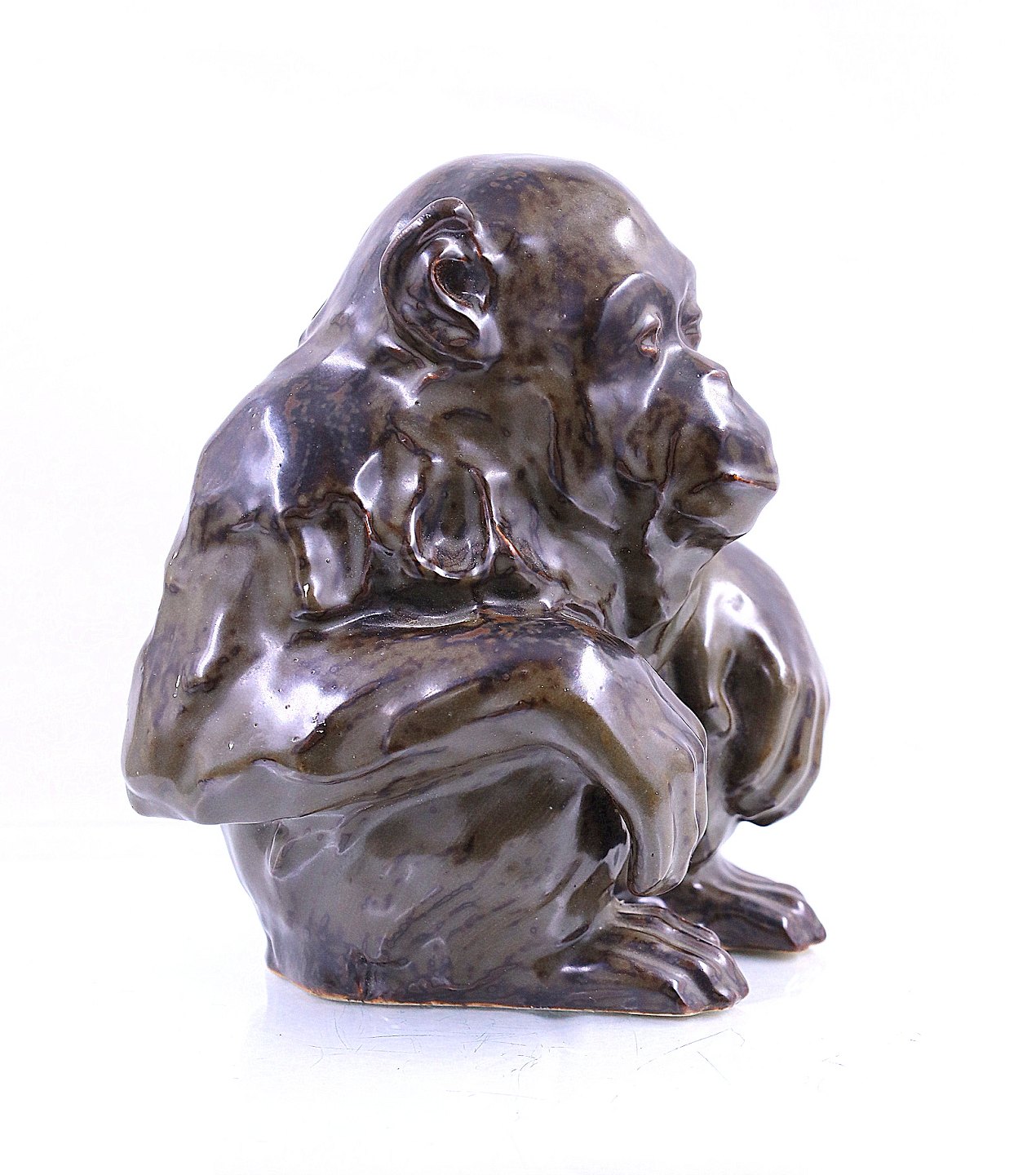 Bing & Grøndahl. Stentøjs figur af chimpanse, nr. 7091, Jean Renè Gauguin. Dansk stentøj, figuren er blank glaseret med sung glasur.