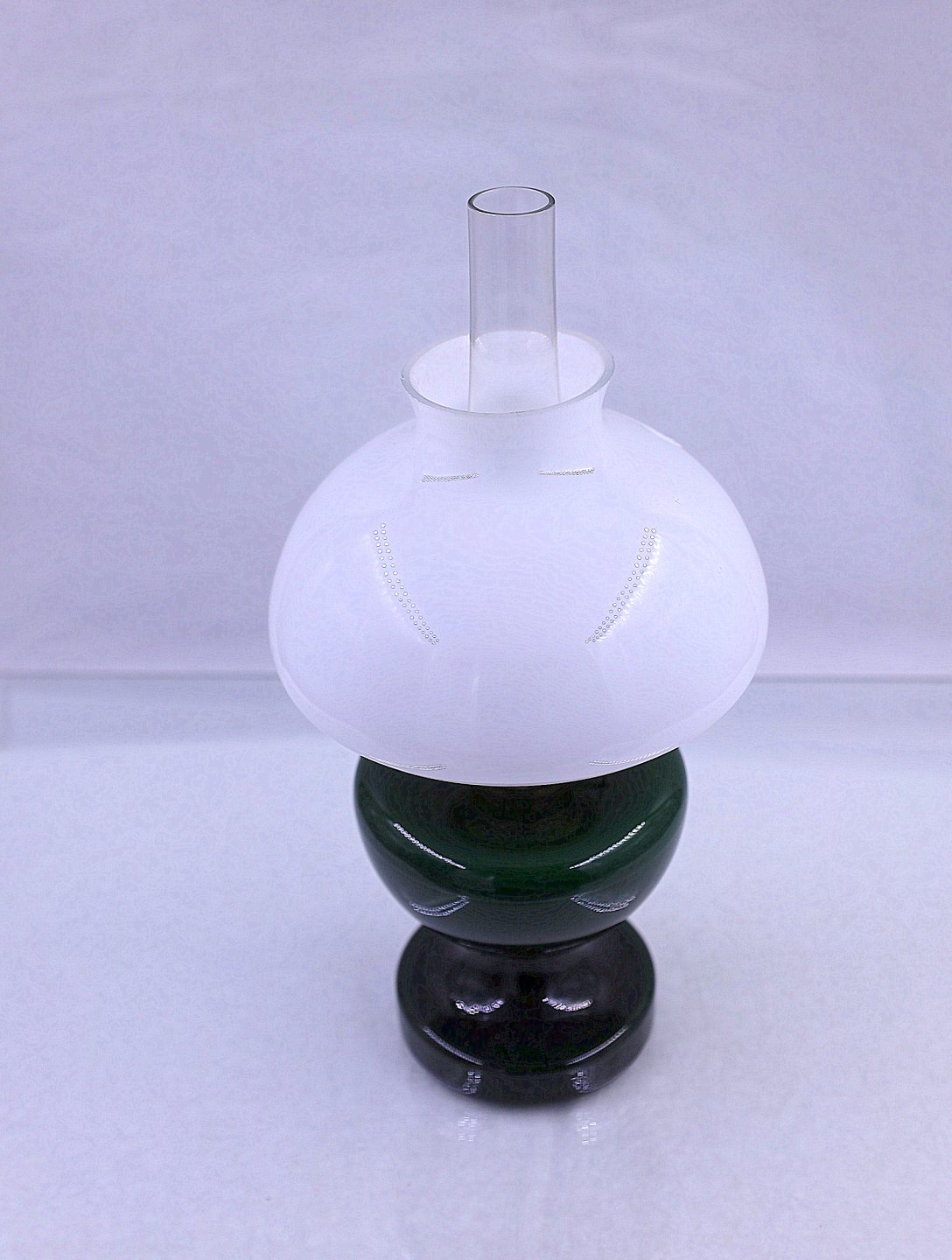 Holmegaards Glasværk. Petroleums bordlampe, Mini- Victoria. Foden på lampen er grøn, og skærmen er af opalglas.