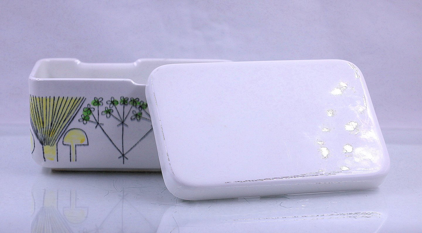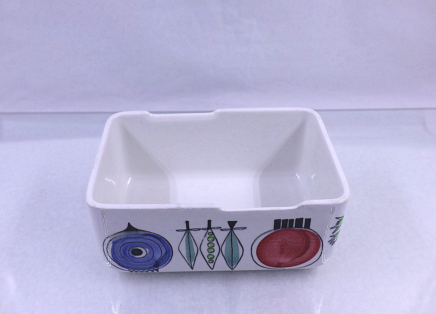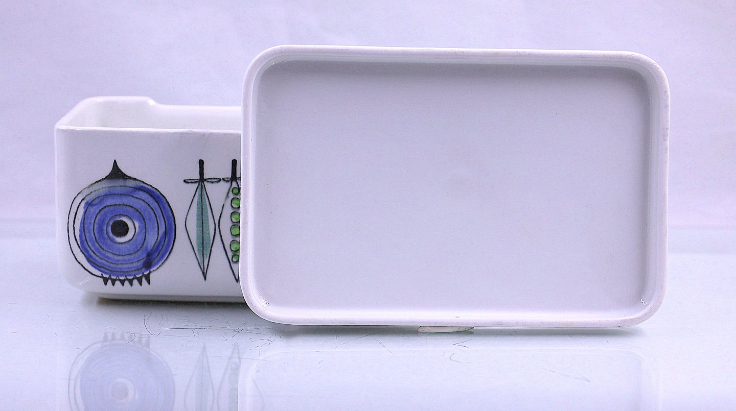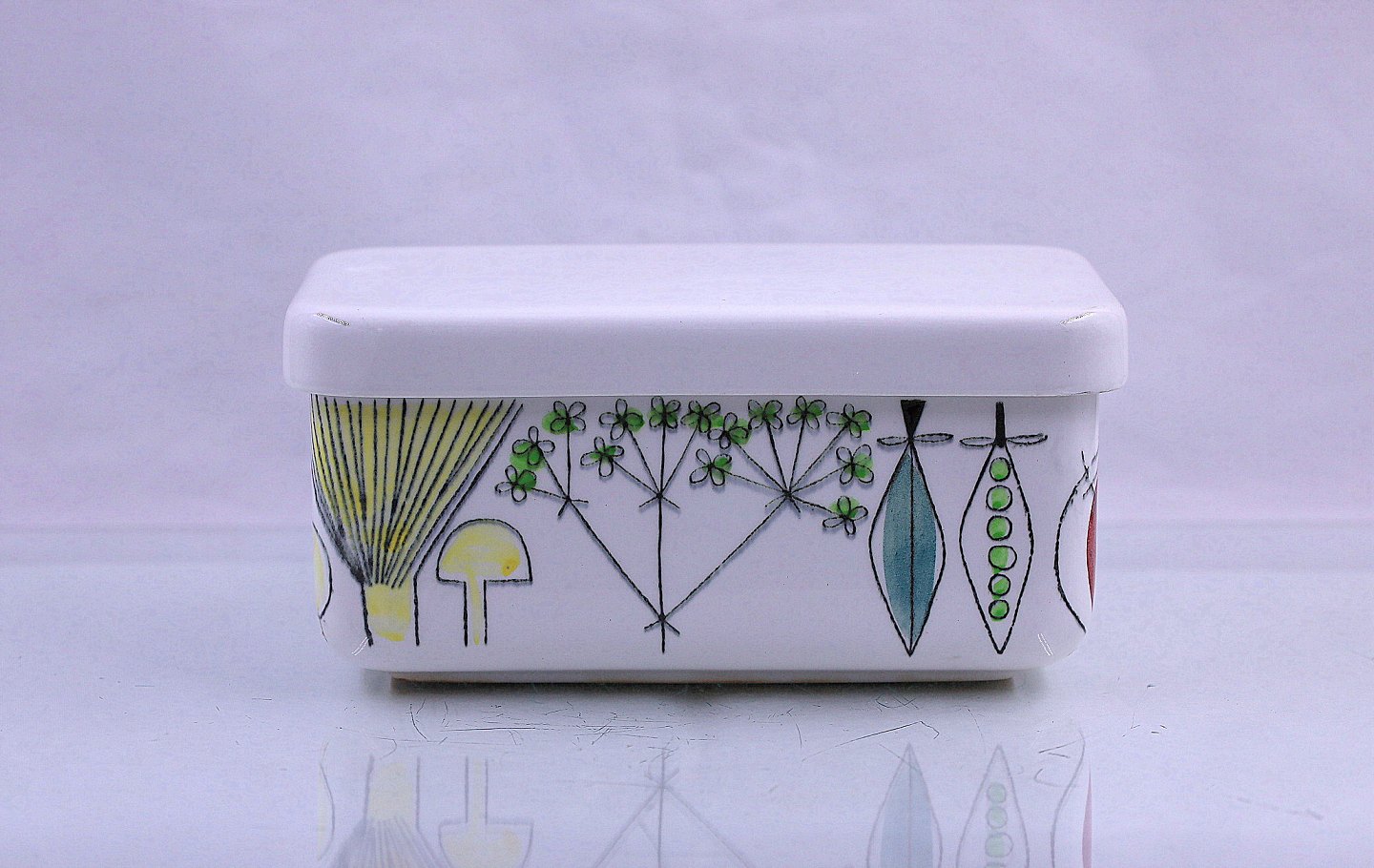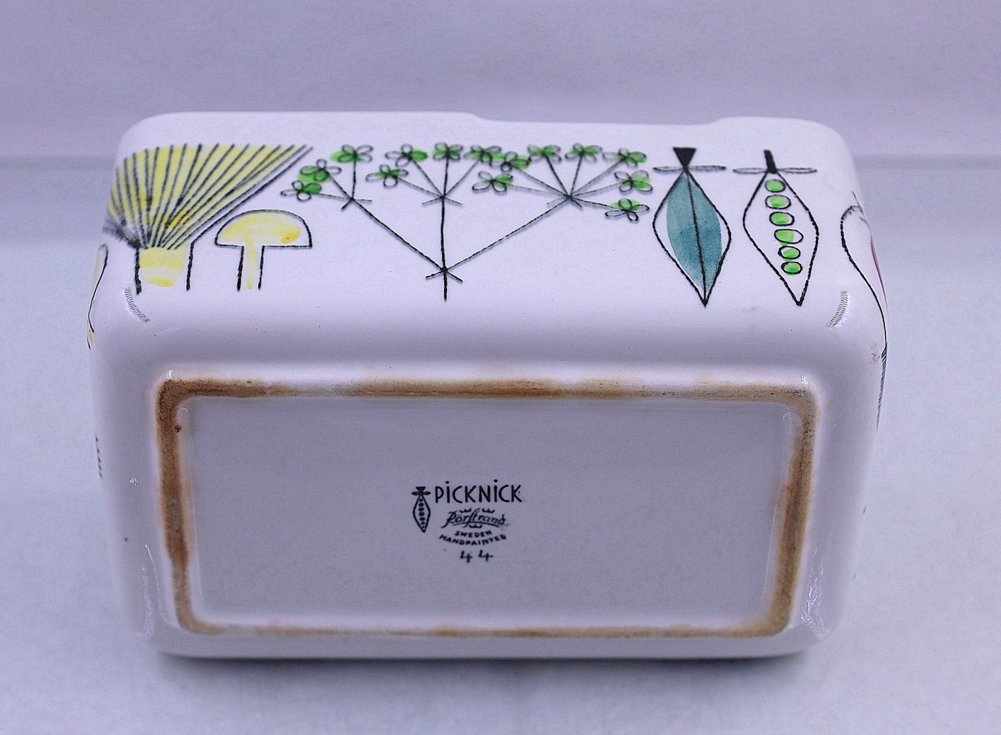 Rørstrand, Sweden. "Picknick" smørboks nr. 44. Boks dekoreret med forskellige grøntsager, boksen er af fajance og med fajance låg.