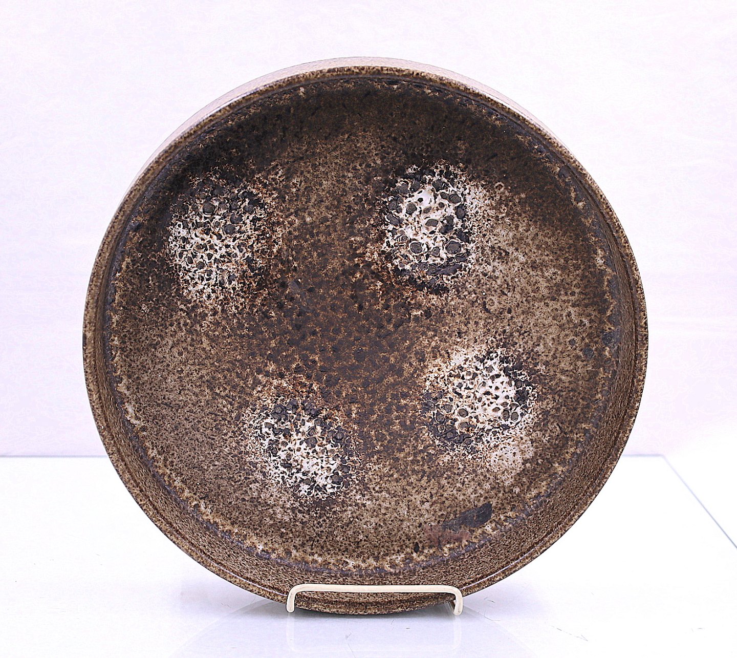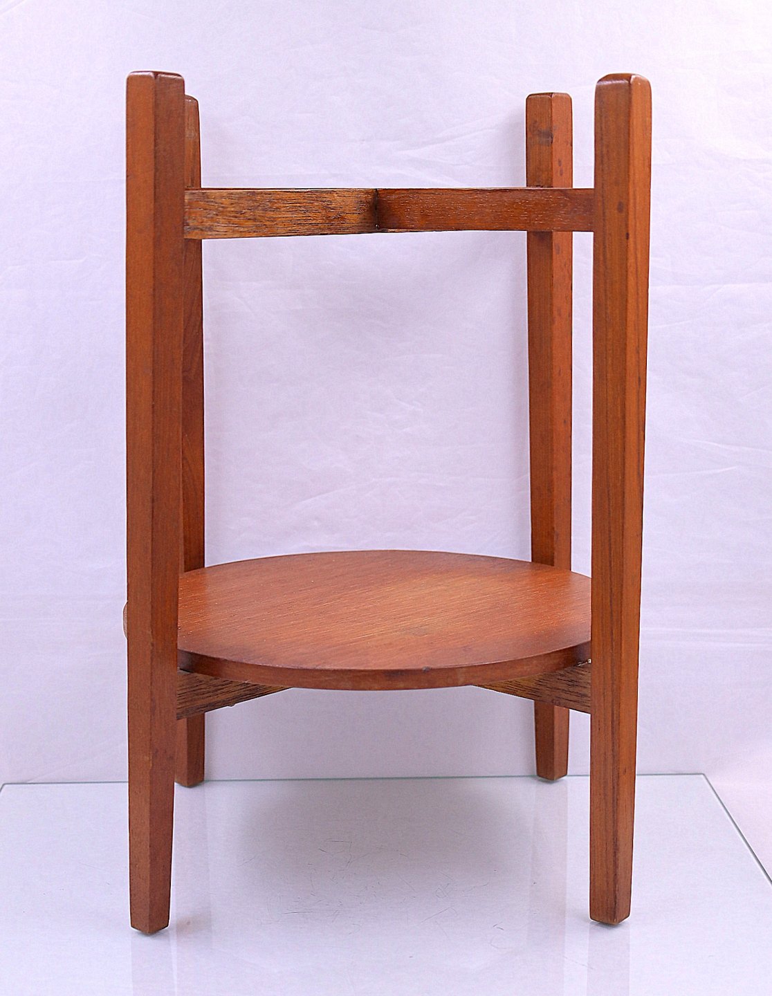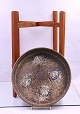 Teaktræsopsats med keramikskål. Teaktræsopsatsen har 4 ben og en hylde. Keramikskål, nr. 342/28, med lava glasur. Skålen er lavet hos Scheurich Keramik, 1959, Kleinheubach West Germany