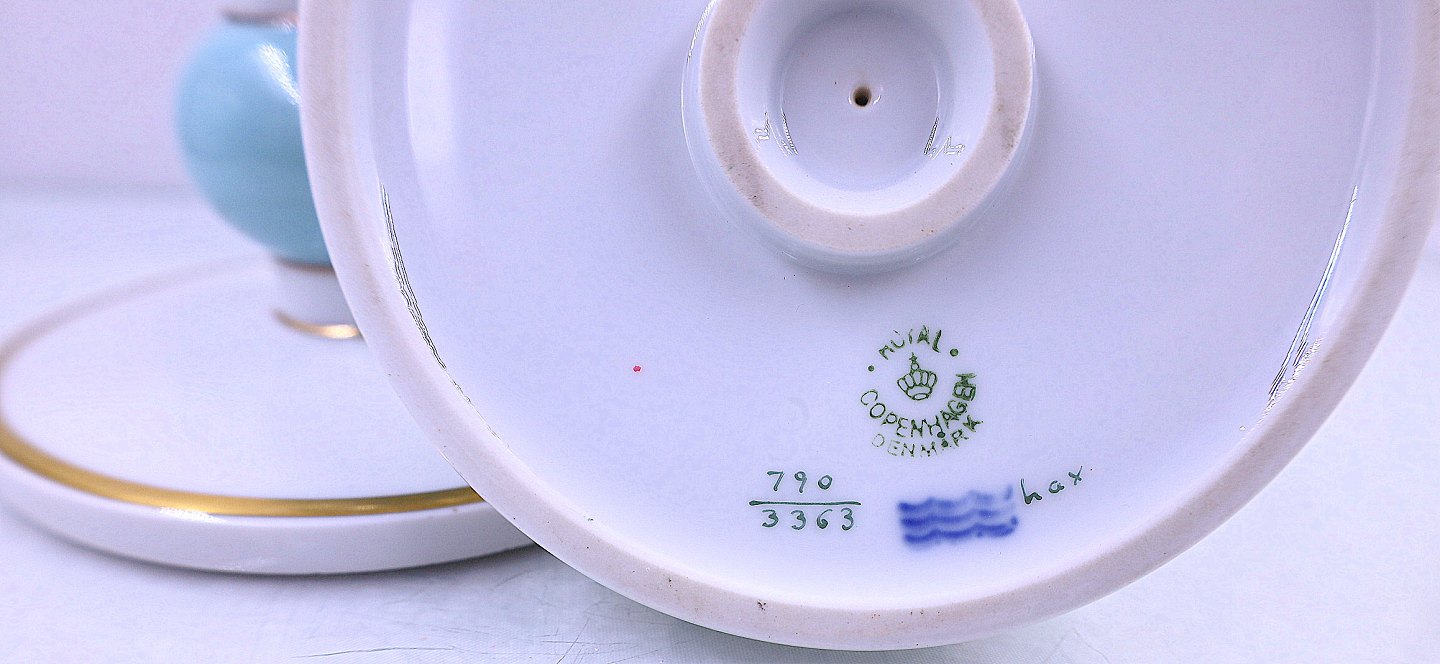 Royal Copenhagen. Lysestager nr. 790/3363. Lave lysestager, der er med lyseblå kugle og guldkant.