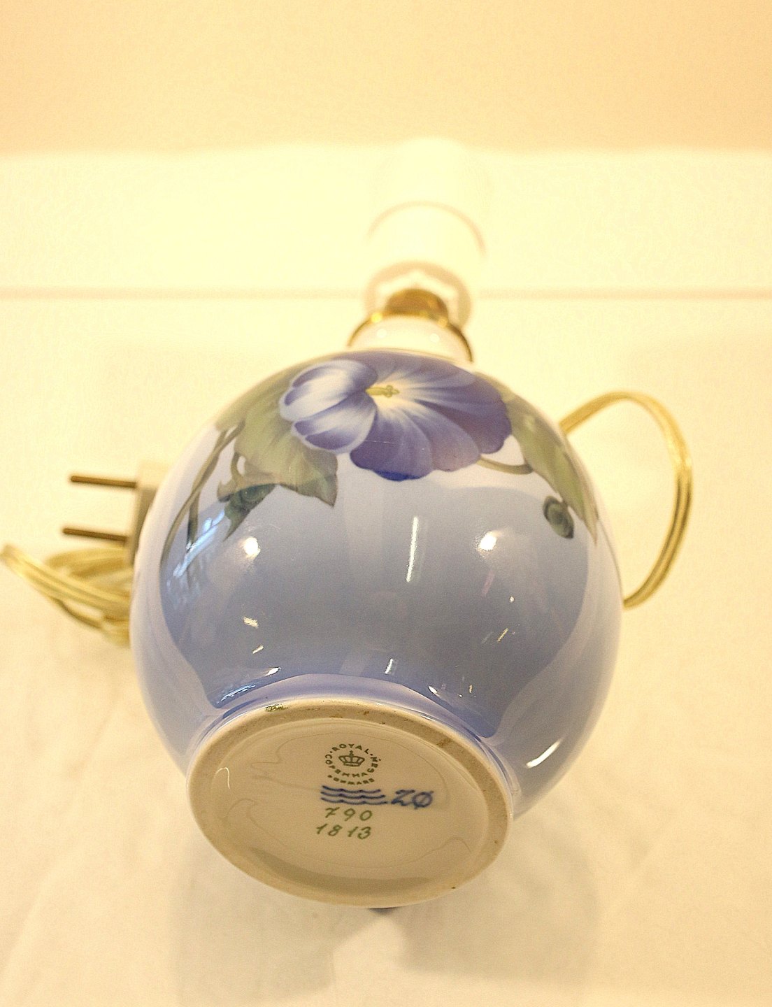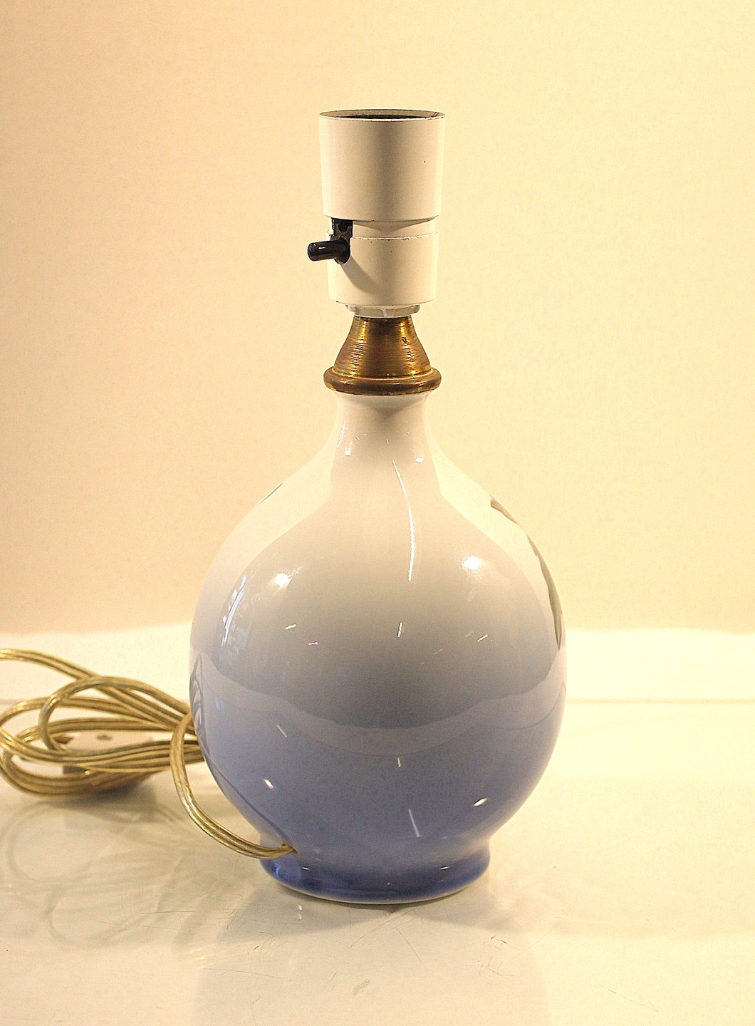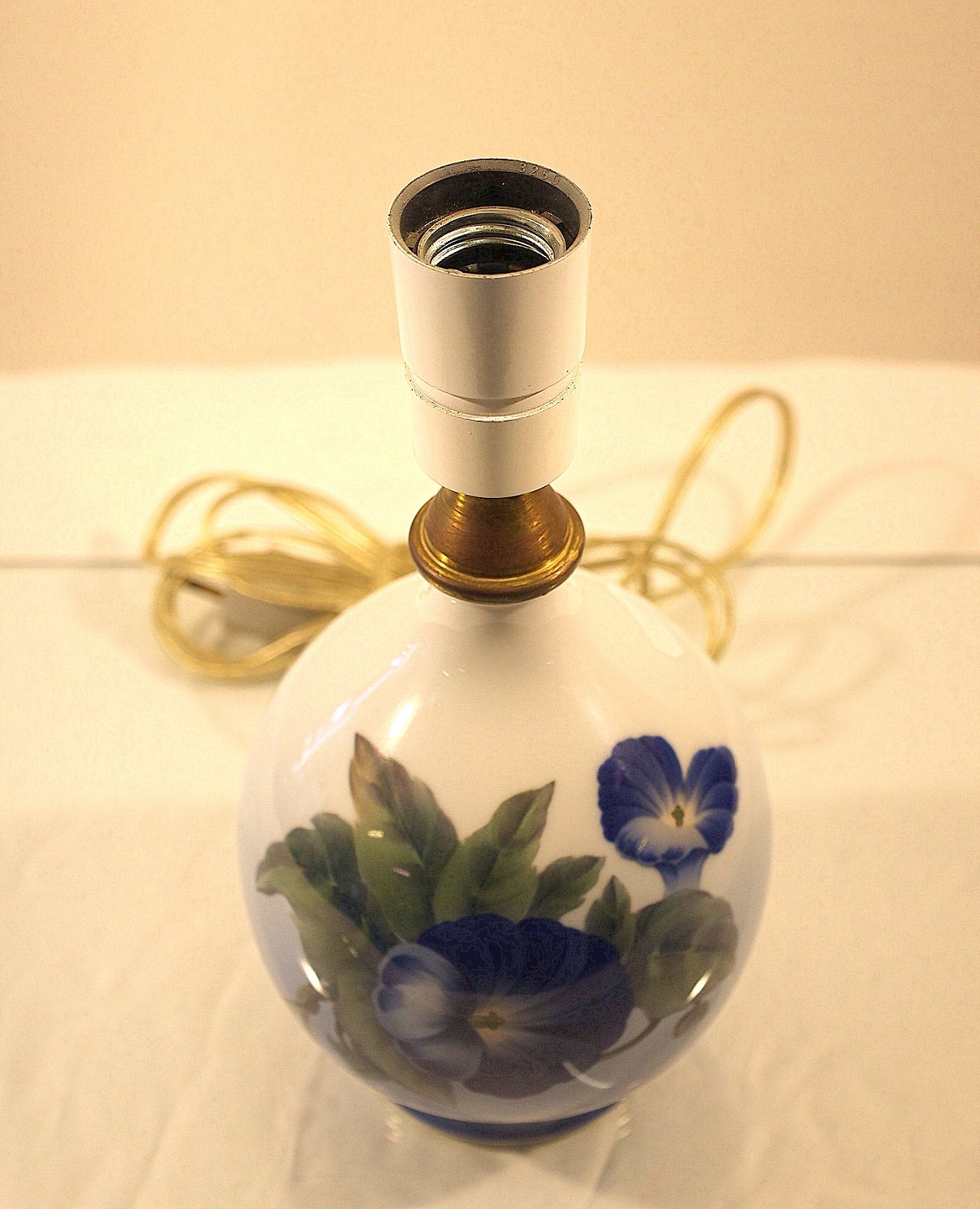 Lampefoden i hvid porcelæn med gradueret blåtonet bund dekoreret med blå pragtsnerle og grønne blade.