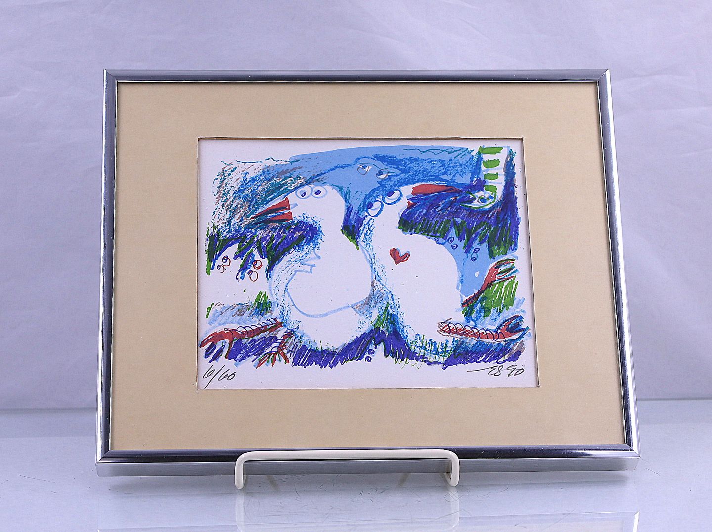 Litografi med 2 fantasi fugle, den ene med rødt hjerte, litografiet er skåret i passe partout og indrammet.