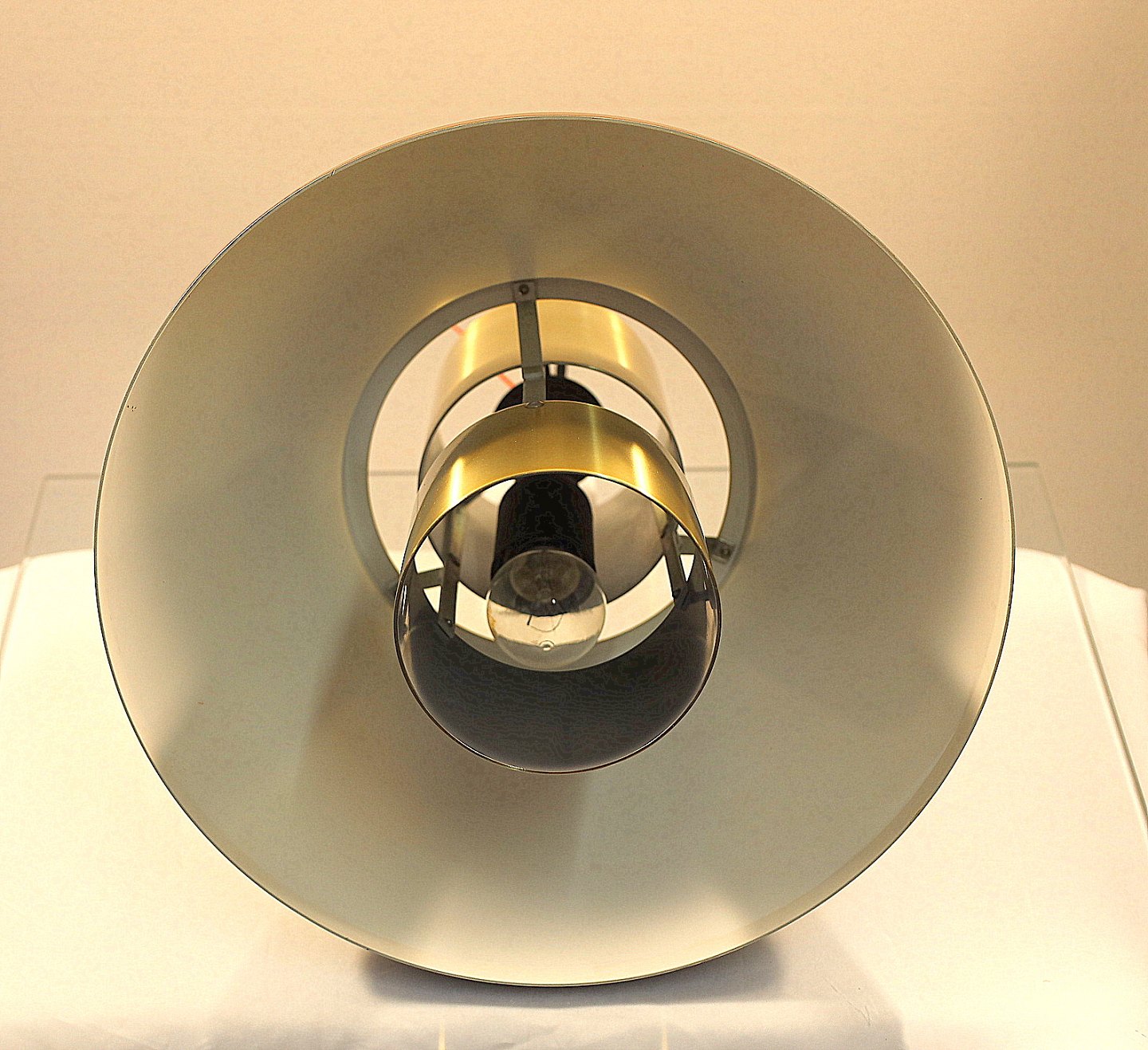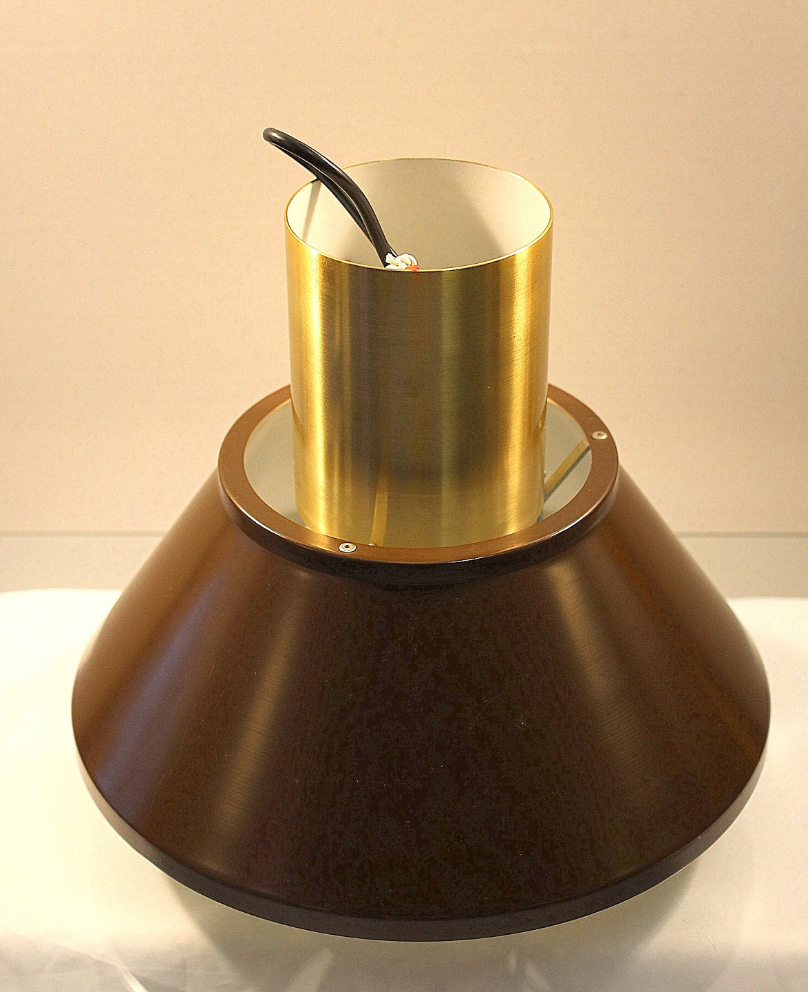 Pendel. Life pendel, brun skærm med messing rør, pendlen er, mat, hvidlakeret indvendig.