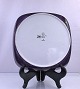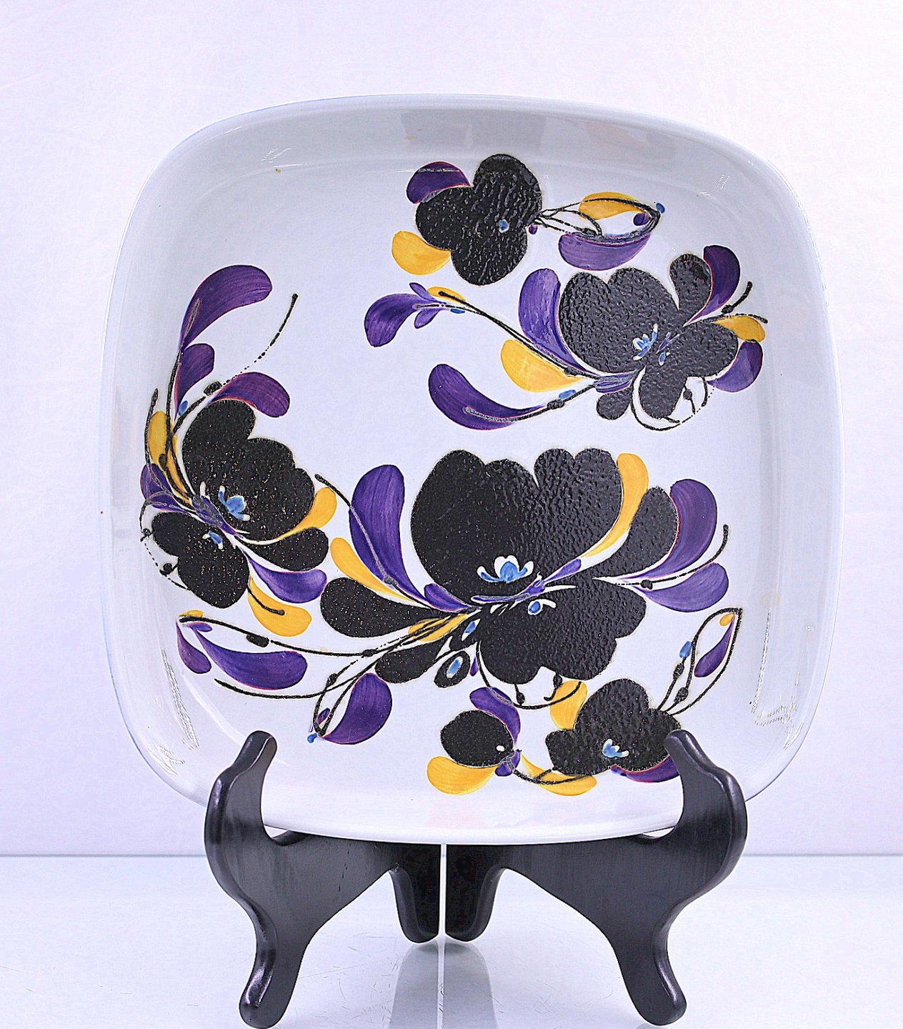 RC Fajance. Tenera, kvadratisk, fajance fad, nr. 954/3775. Fadet er dekoreret med lilla, sorte og gule blomster.