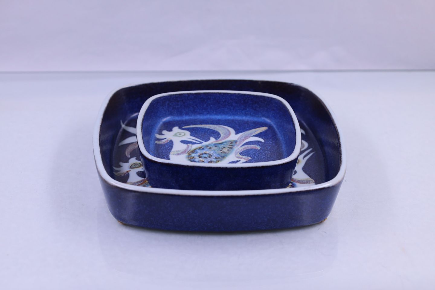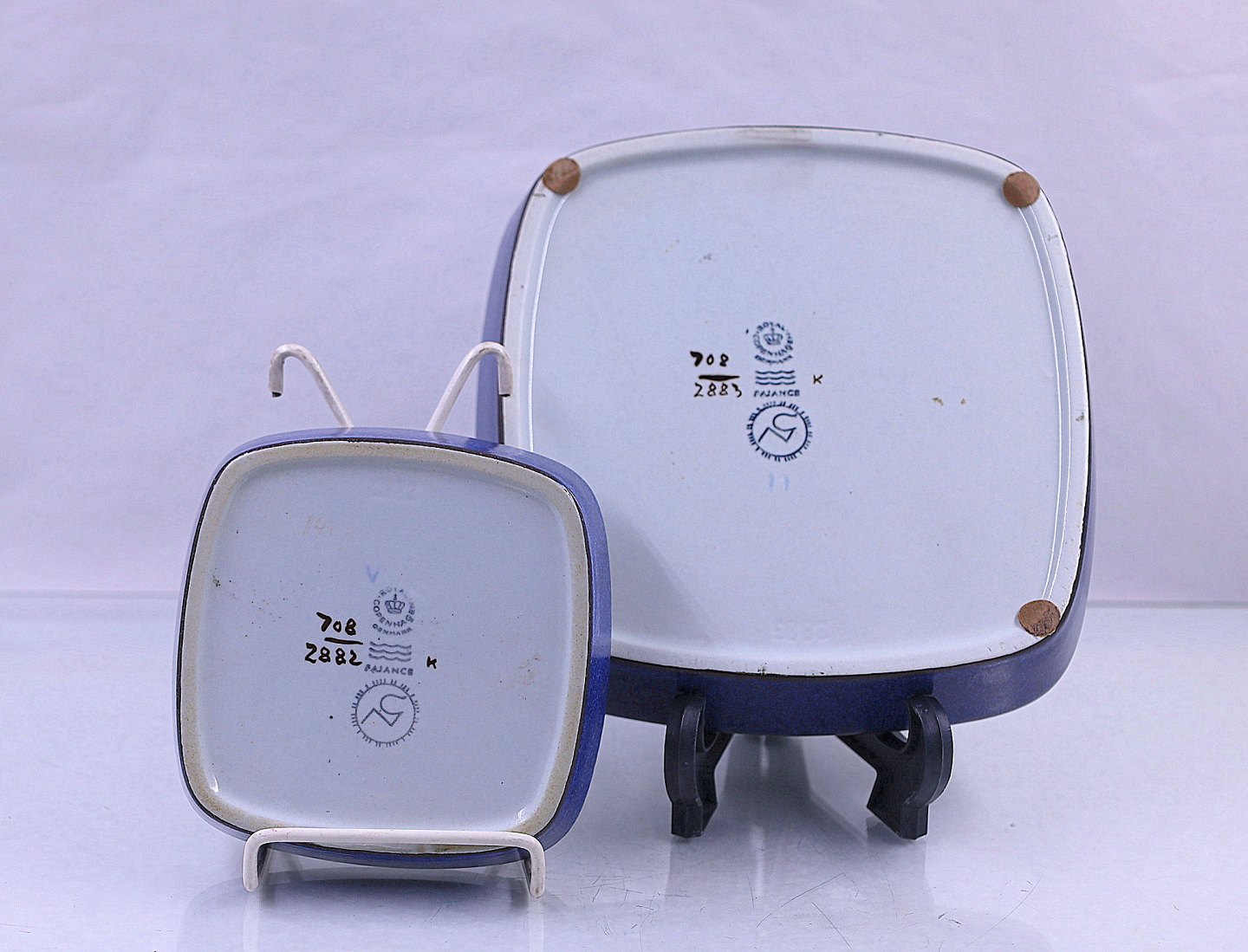 Kgl. Blå Baca fajance fade. Firkantet fade med fuglemotiv