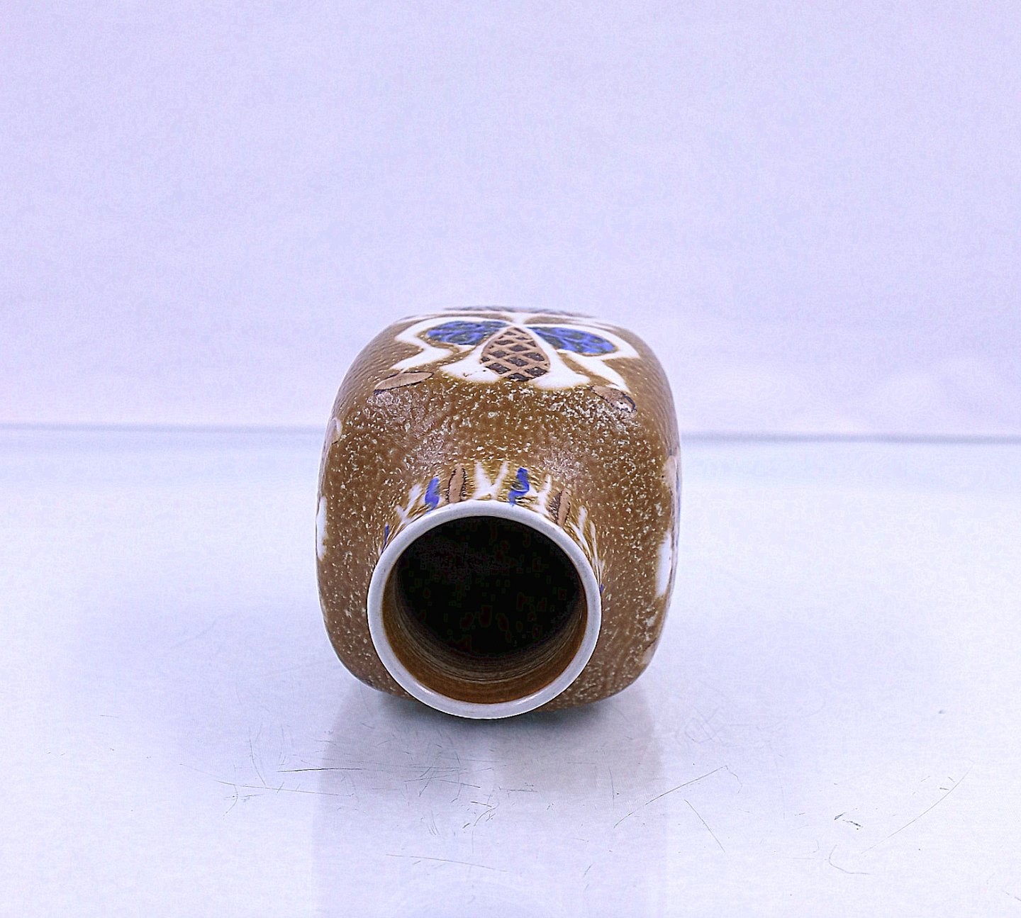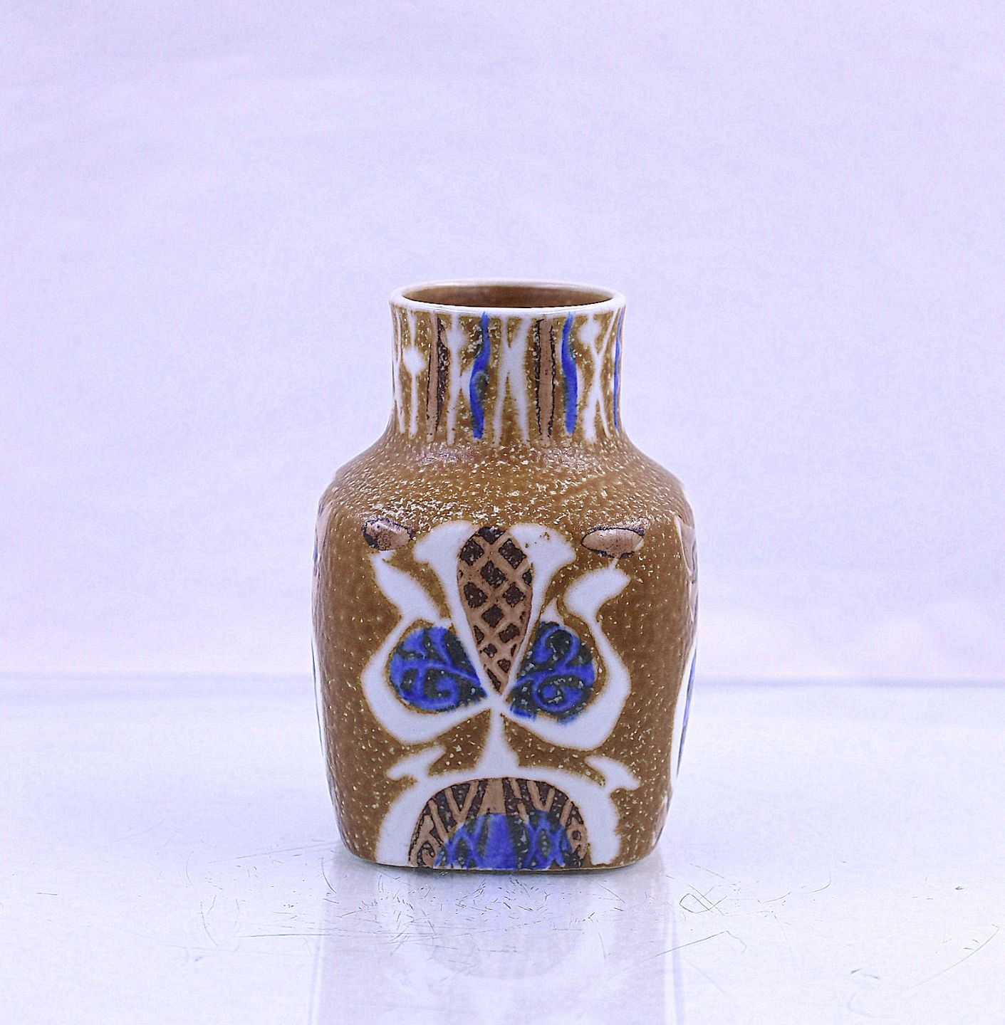Vasen er dekoreret med brunt/blåt abstrakt mønster.