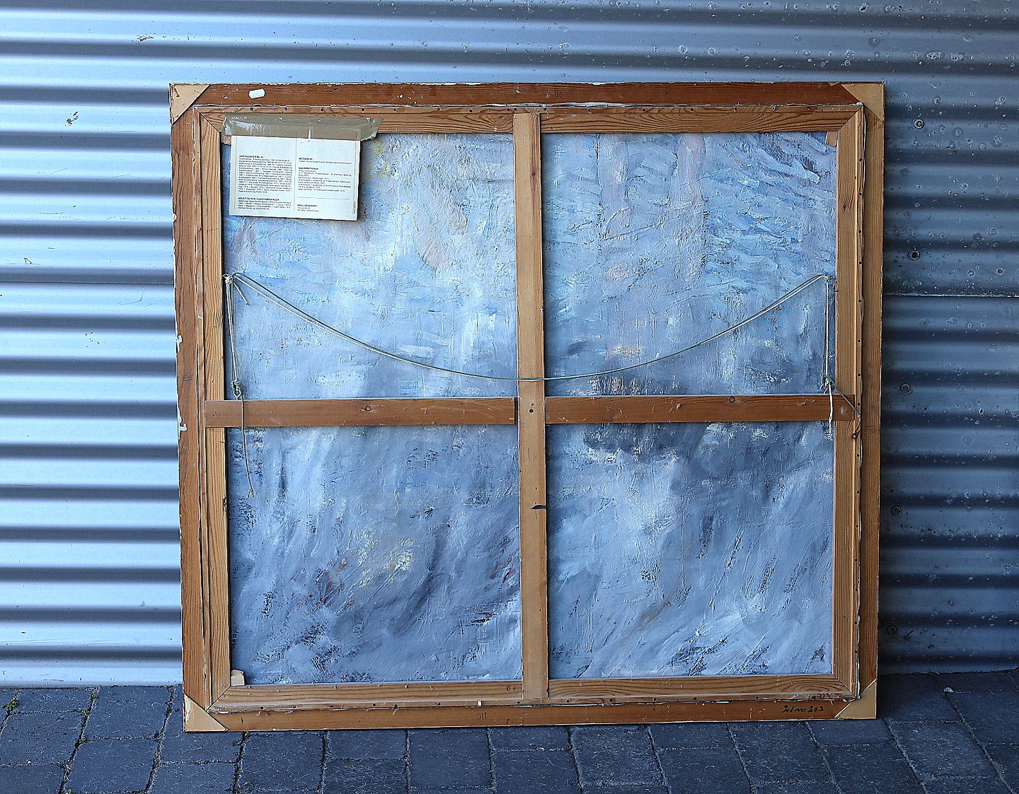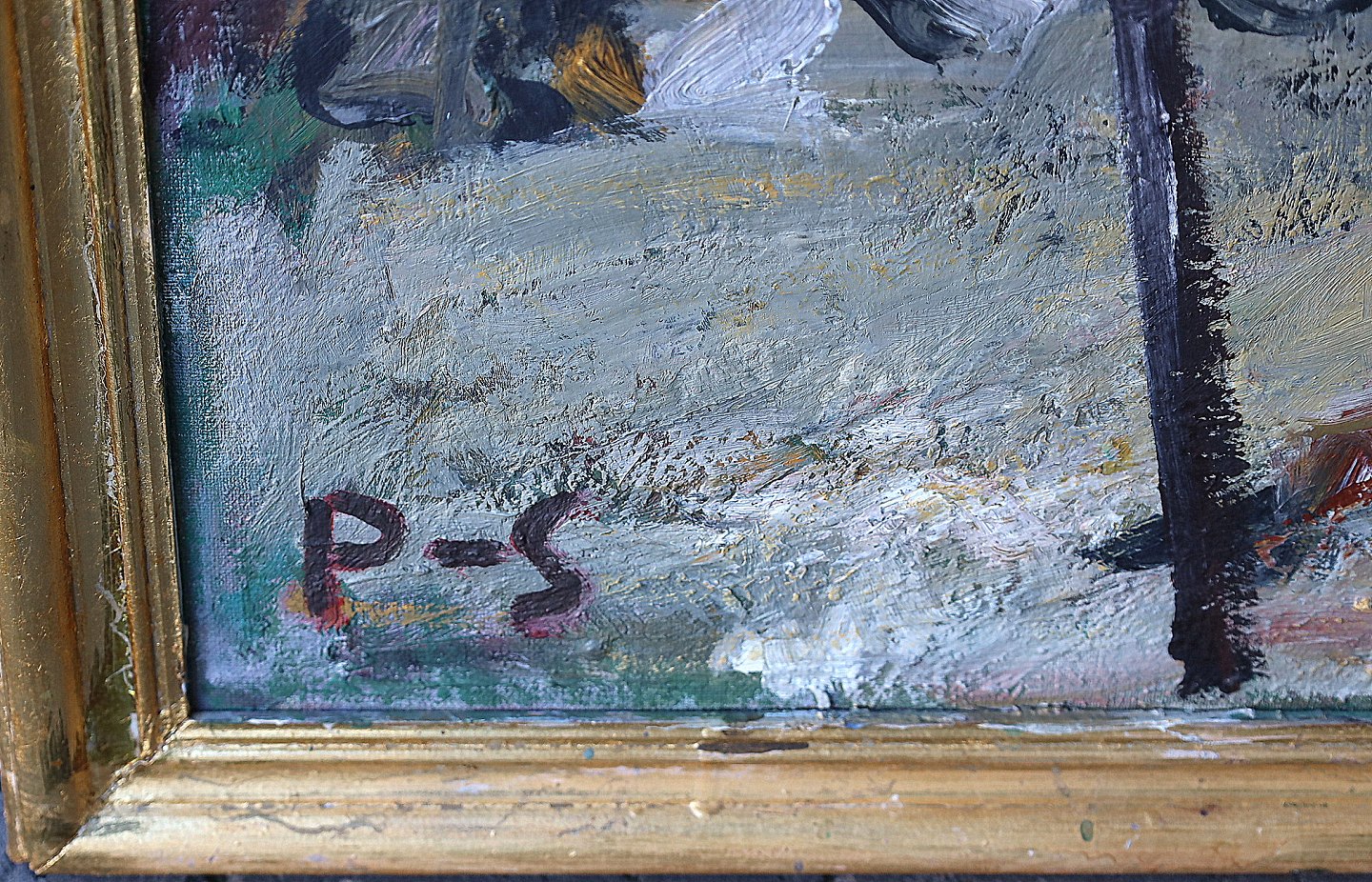 Maleri. Poul Sørensen født 1931-død 2018. Maleri af fiskerhuse, i Frederikshavn, hvor maleren har ladet maleriet fortsætte ud over rammen, guldramme, og således patenteret rammen. Maleri med fiskerhuse i forskellige farver og en jolle, der ligger på hovedet, i forgrunden. Maleren har også malet bagsiden.