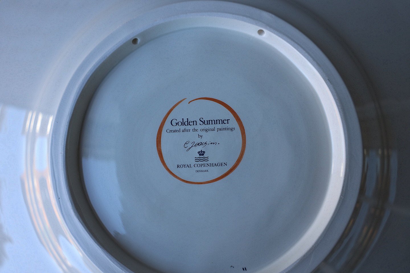 Royal Copenhagen. Gylden Sommer, nr. 1739733, rundt serveringsfad, fajance. Fadet er forberedt til ophæng.
