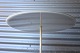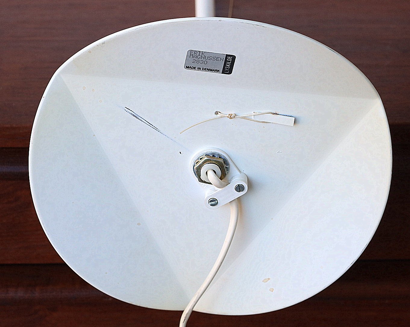 Erik Magnussen bordlampe, nr. 2830, fra Lyskilden. Bordlampen er af mat hvidlakeret metal og under skærm sidder der en plast skærm, lampen tændes og slukkes via snoretræk.