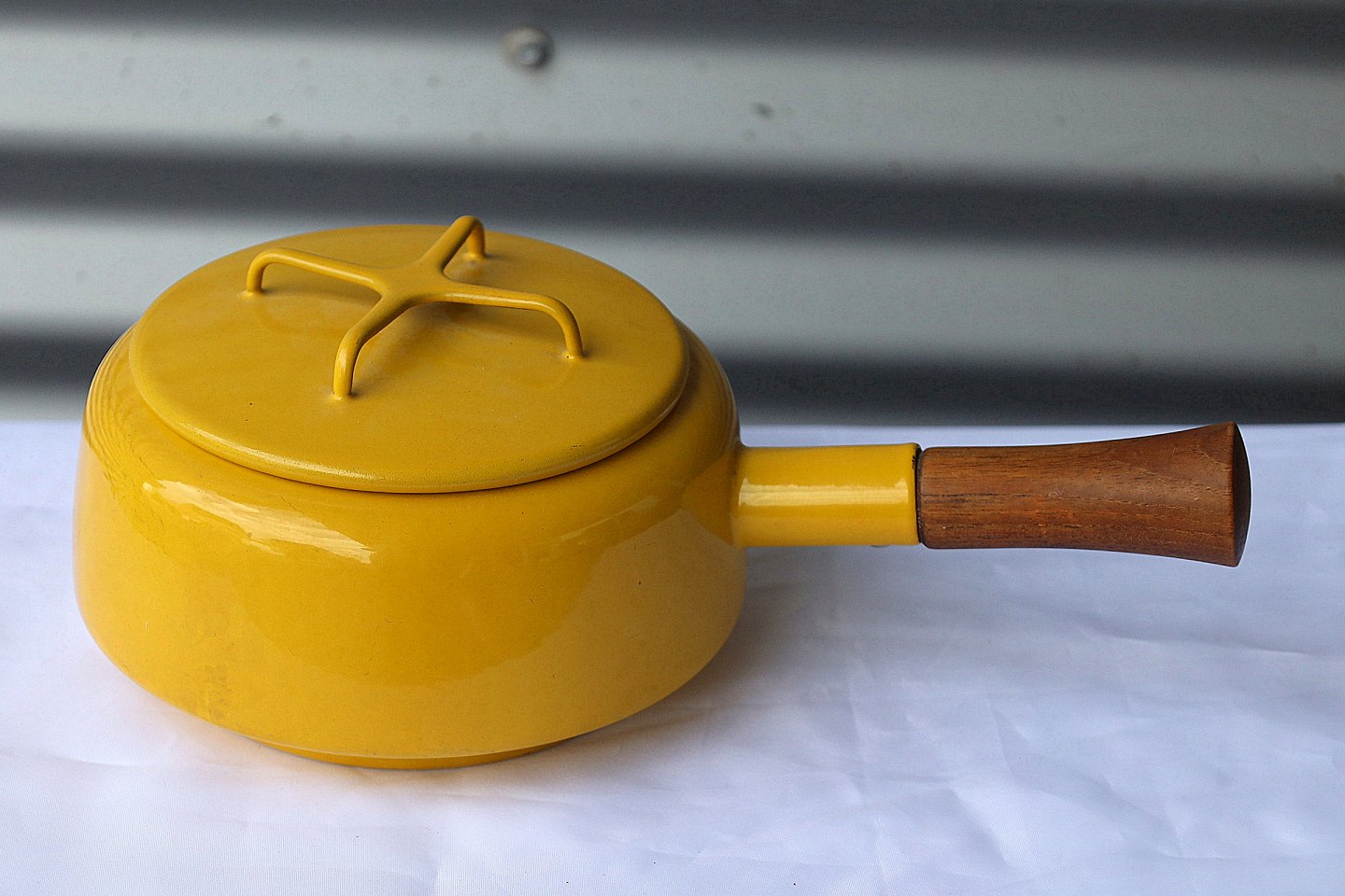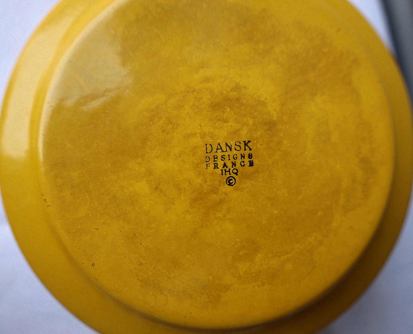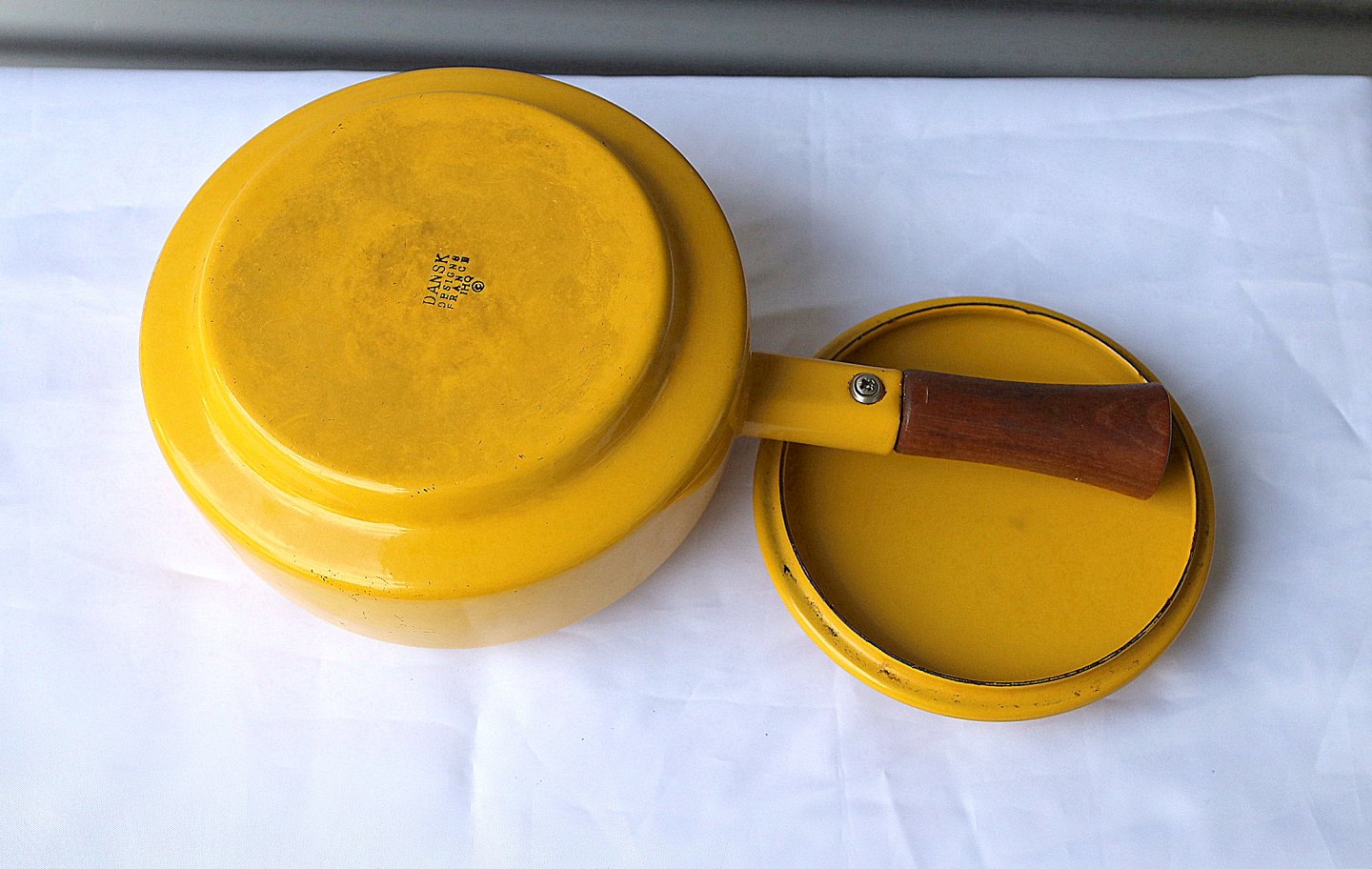 IHQ = Jens Harald Quistgaard. Gul fonduegryde med brænder. Gryde "France". Gryden er gul emaljeret jern og brænderen er støbejern. Fondue sættet bliver kaldet " Kobenstyle". Fondue sættet kommer med gryde med teaktræ håndtag, og brænder med låg med teaktræ håndtag og fødder af teaktræ.