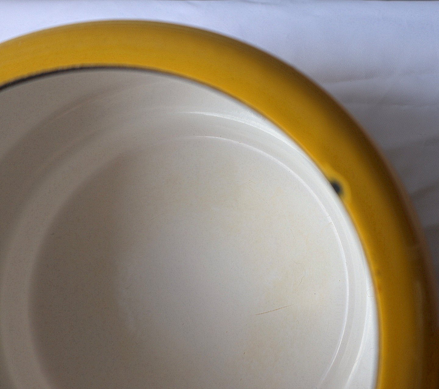 Der er et lille afslag, i emaljen, på øverste kant af gryden.