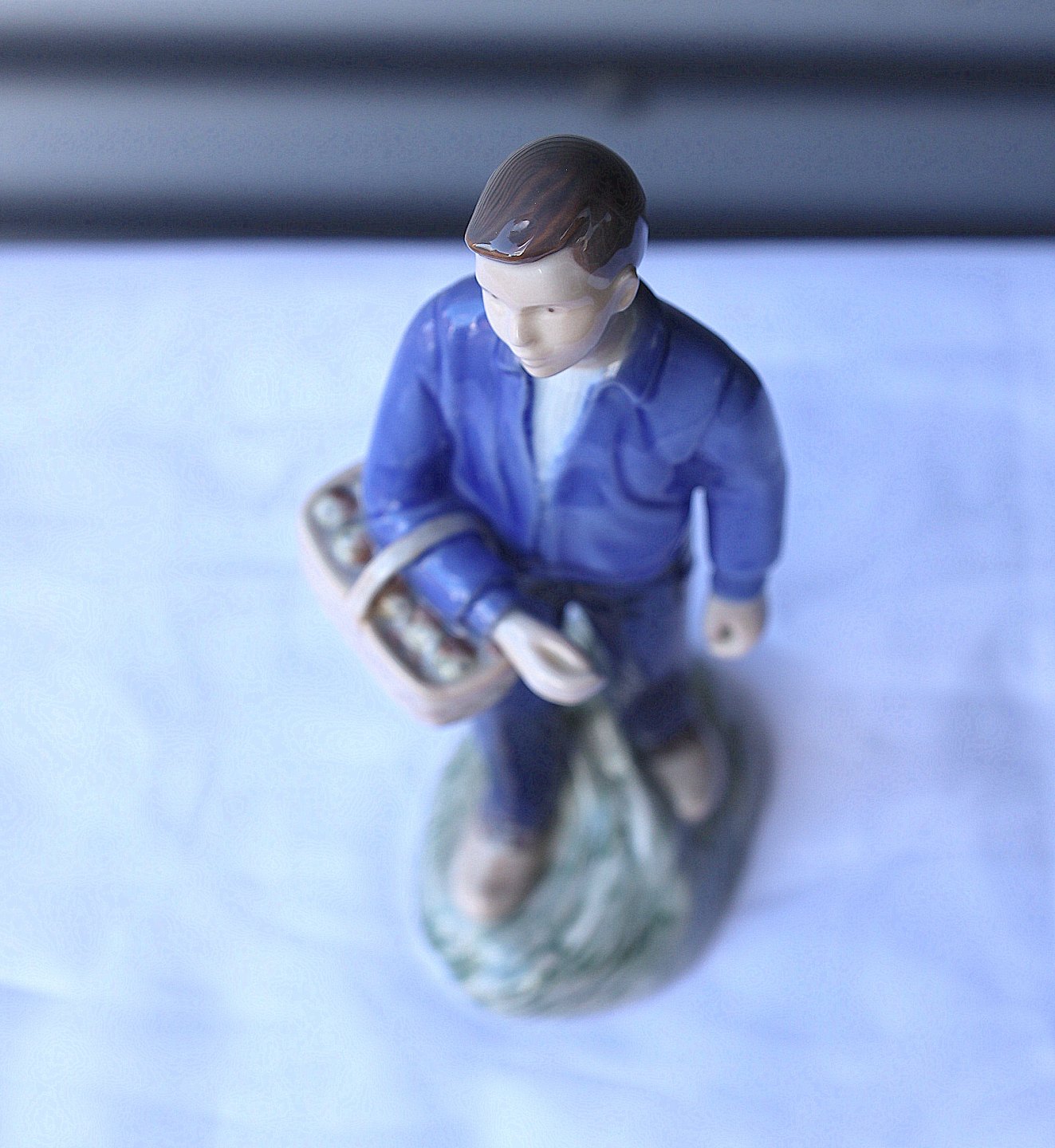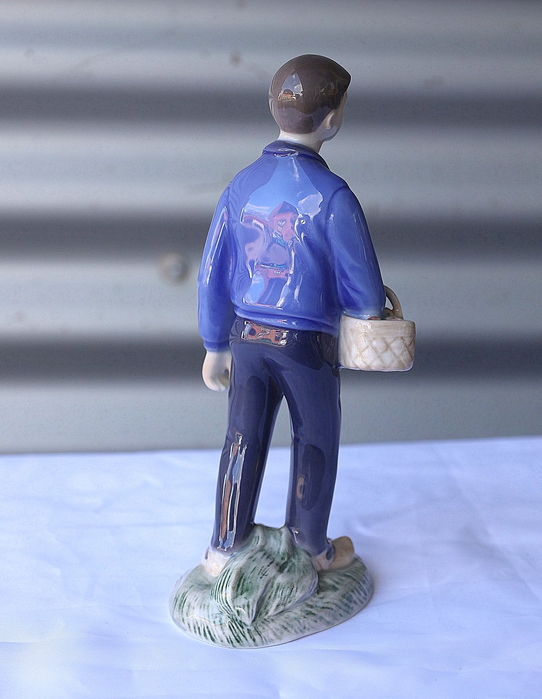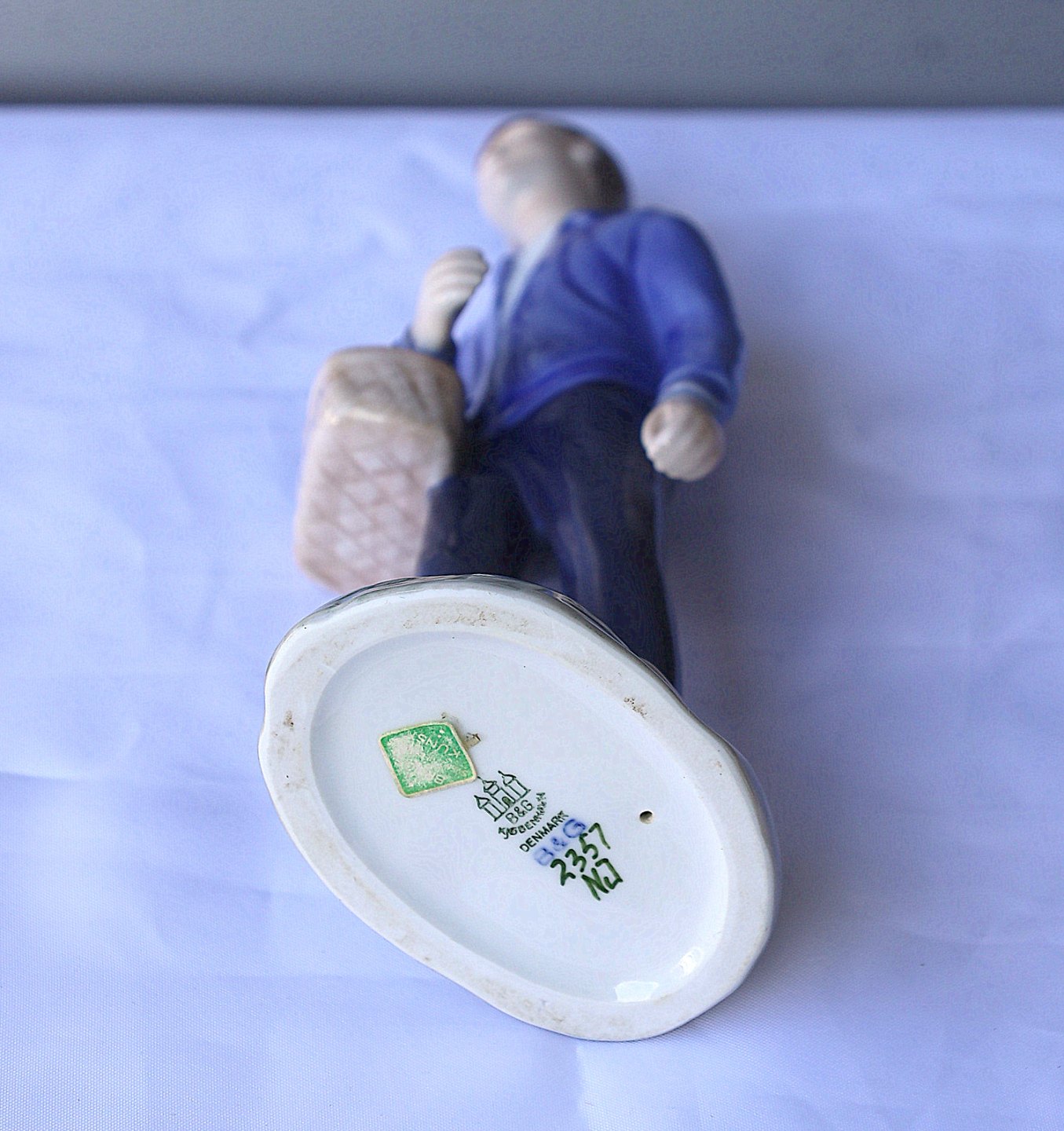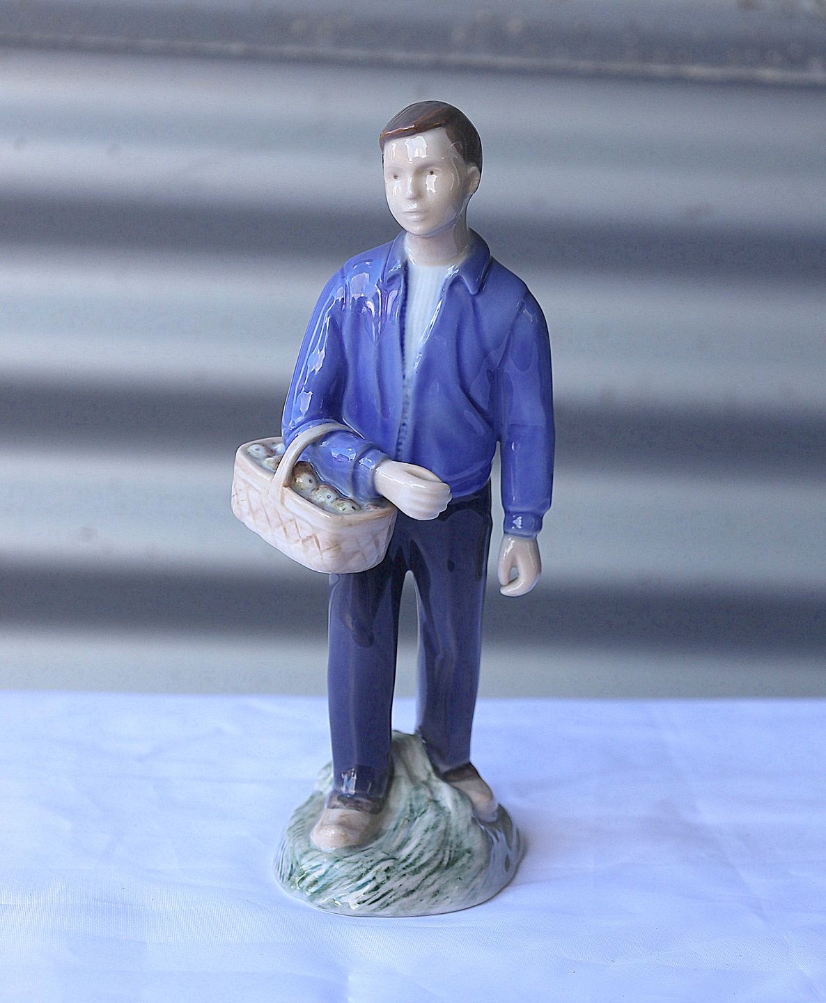 Bing & Grøndahl. Dreng med kurv, nr. 2357. Figuren er i de klassiske blå/hvid farver.